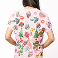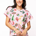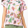 This light pink tee brings festive cheer with sparkling sequin Christmas icons that shine bright. Soft and comfortable, it’s perfect for adding a playful sparkle to your holiday outfit while keeping things cozy. Celebrate the season in style with this glittering, fun-to-wear tee!