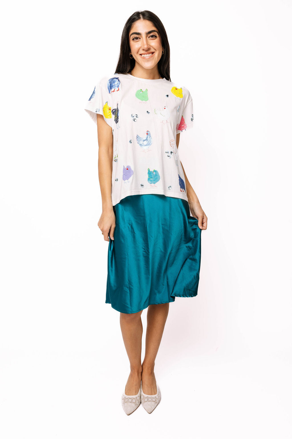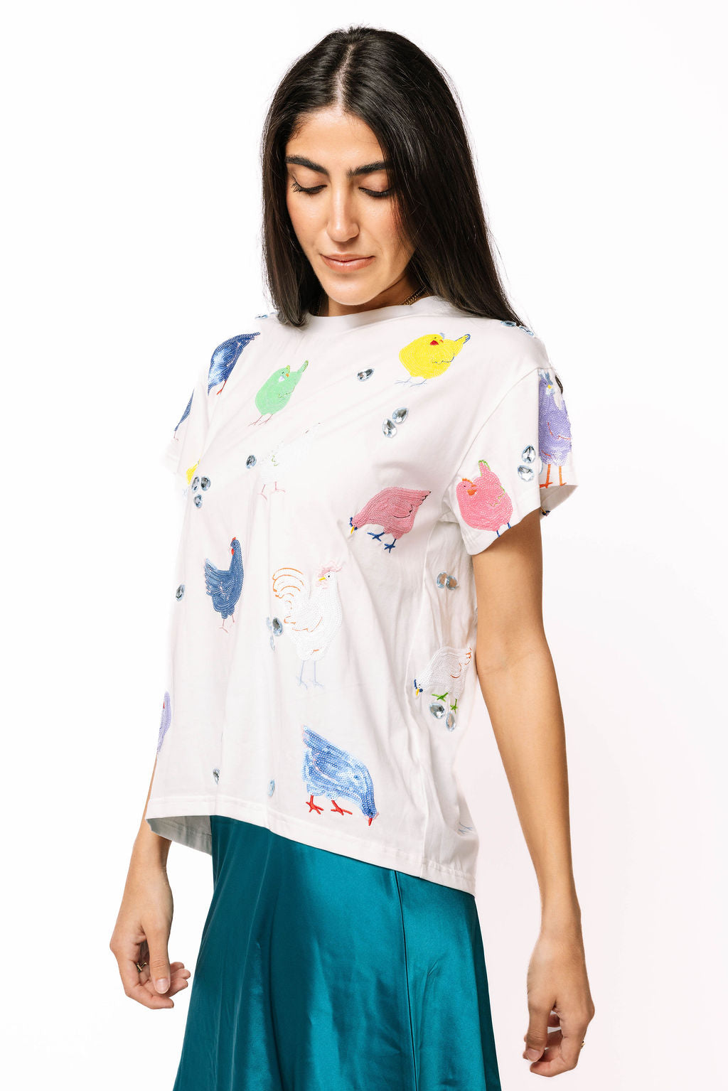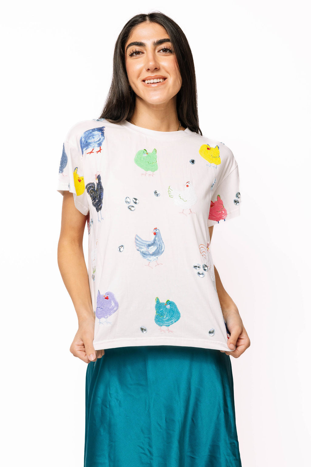 Strut into spring with this playful white tee featuring a vibrant flock of sequin chickens and sparkling rhinestone eggs. The multi-color sequin details catch the light with every move, while the shimmering egg accents add whimsical charm. Perfect for anyone who loves bold, eye-catching style with a fun twist. This tee brings personality and pizzazz to your seasonal wardrobe—a must-have piece that celebrates individuality and joy.