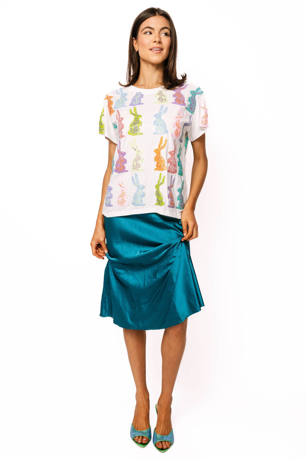 Hop into spring style with this vibrant white tee featuring playful multi-color Easter bunny designs across the front and back. Perfect for holiday celebrations, casual outings, or spreading festive cheer, this comfortable cotton blend keeps you looking cheerful all season long. The eye-catching bunny graphics in bold, cheerful hues make it an instant conversation starter. Whether you're celebrating Easter or just love whimsical designs, this tee delivers personality and comfort in one delightful package.