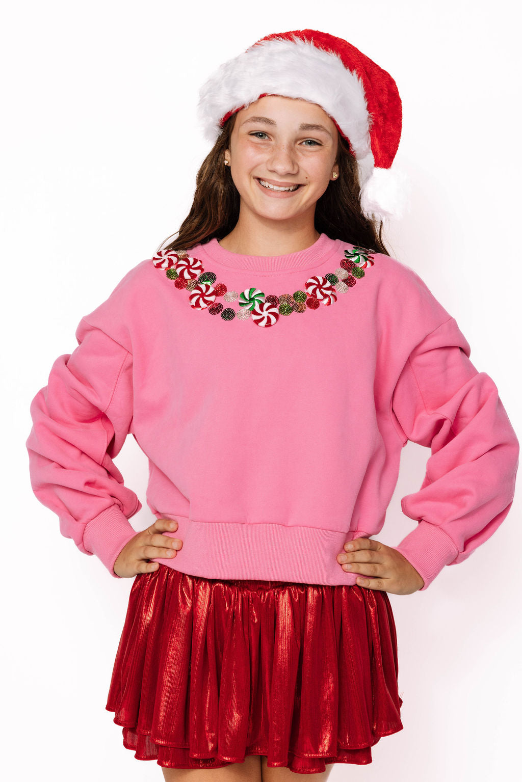 Add a sweet twist to your cozy style with this hot pink slightly cropped sweatshirt, featuring a playful beaded peppermint necklace that wraps from front to back. Perfect for adding a pop of fun and flair to your casual look while staying comfy all day long.