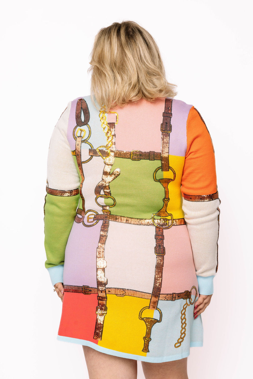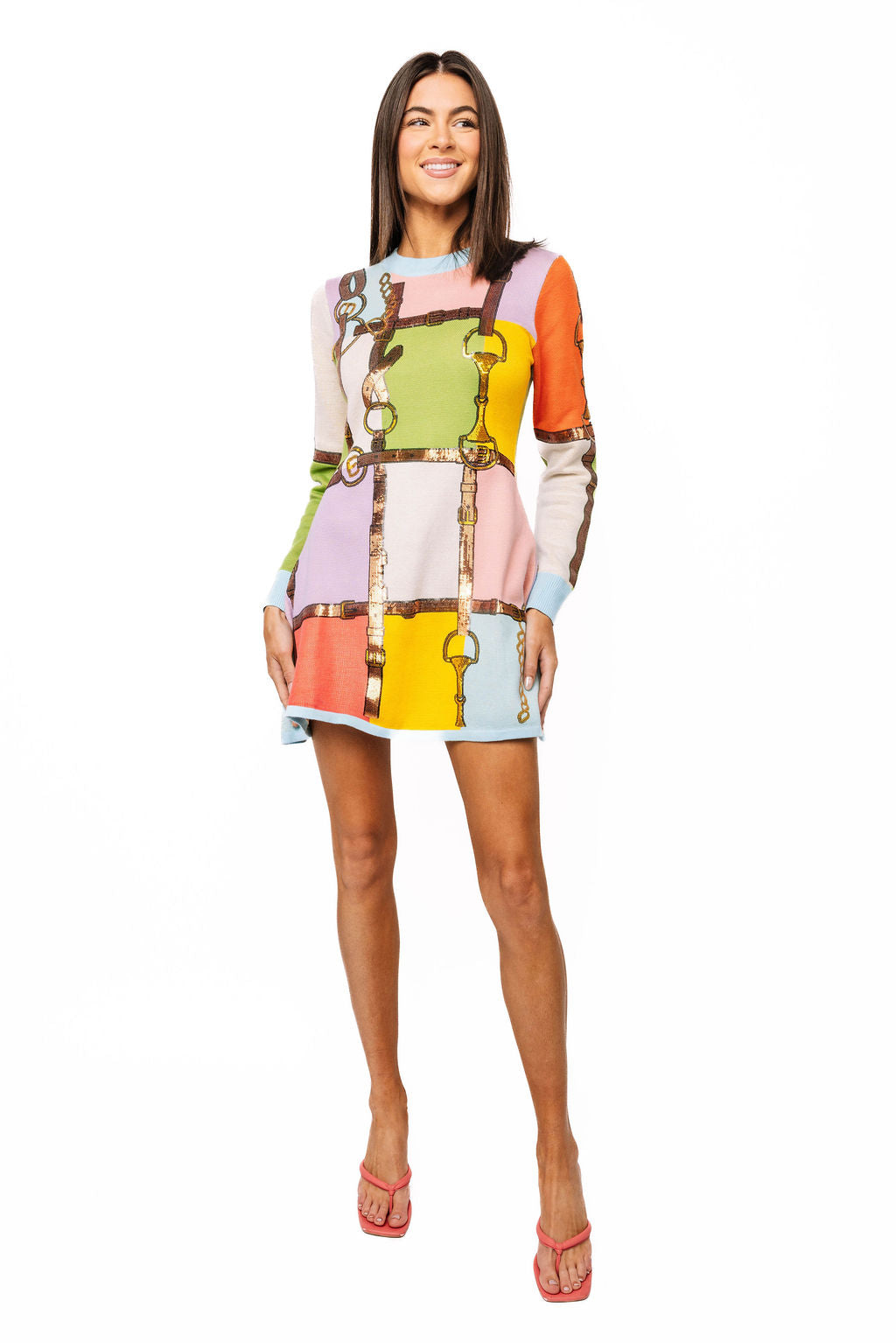 Multi Colorblock Knit Horse Bit Long Sleeve Dress