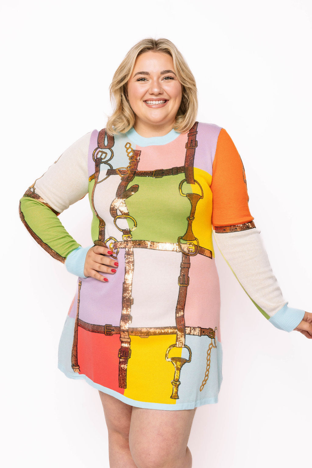 Elevate your derby day style with this striking long sleeve sweater dress featuring bold colorblock panels and signature horse bit details on the front and back. The cozy knit construction makes it perfect for watch parties, tailgates, and casual outings. Versatile enough to dress up or down, this piece combines equestrian-inspired sophistication with modern color blocking for a look that stands out in any crowd.