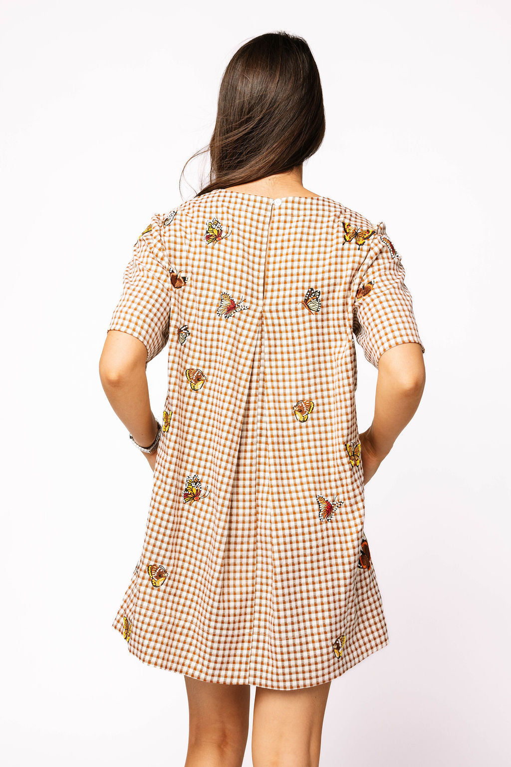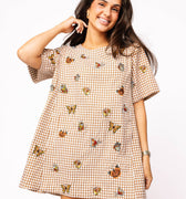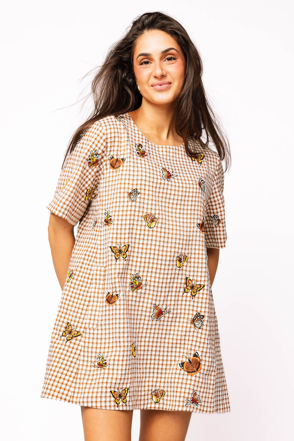 Step into sunshine with the Brown Plaid Butterfly Short Sleeve Dress! This playful dress combines cozy plaid with fluttery butterfly sleeves for a flirty, fun look. Perfect for twirling through your day, it balances casual comfort with charming style. Whether you're brunching or exploring, this dress brings lighthearted flair to every moment.