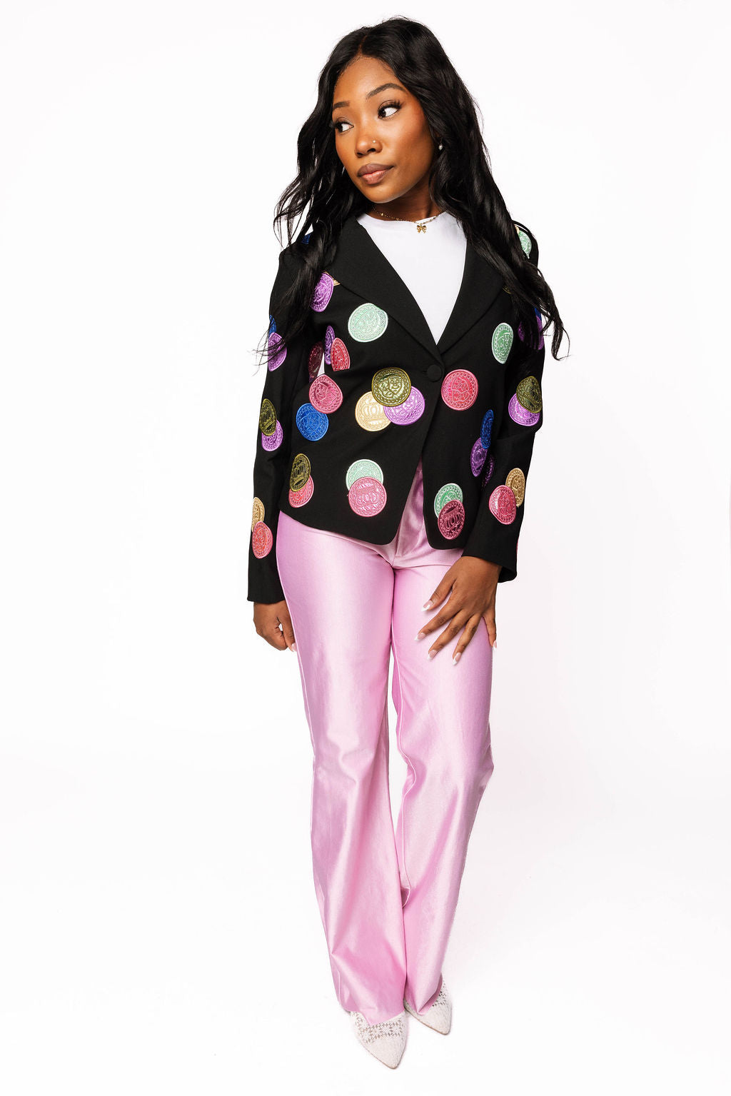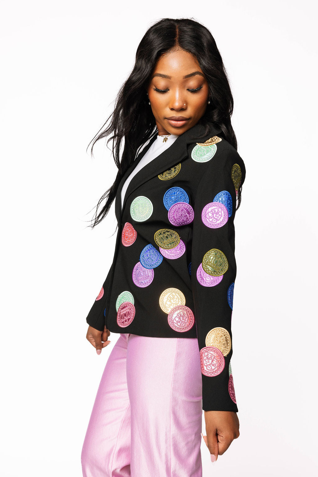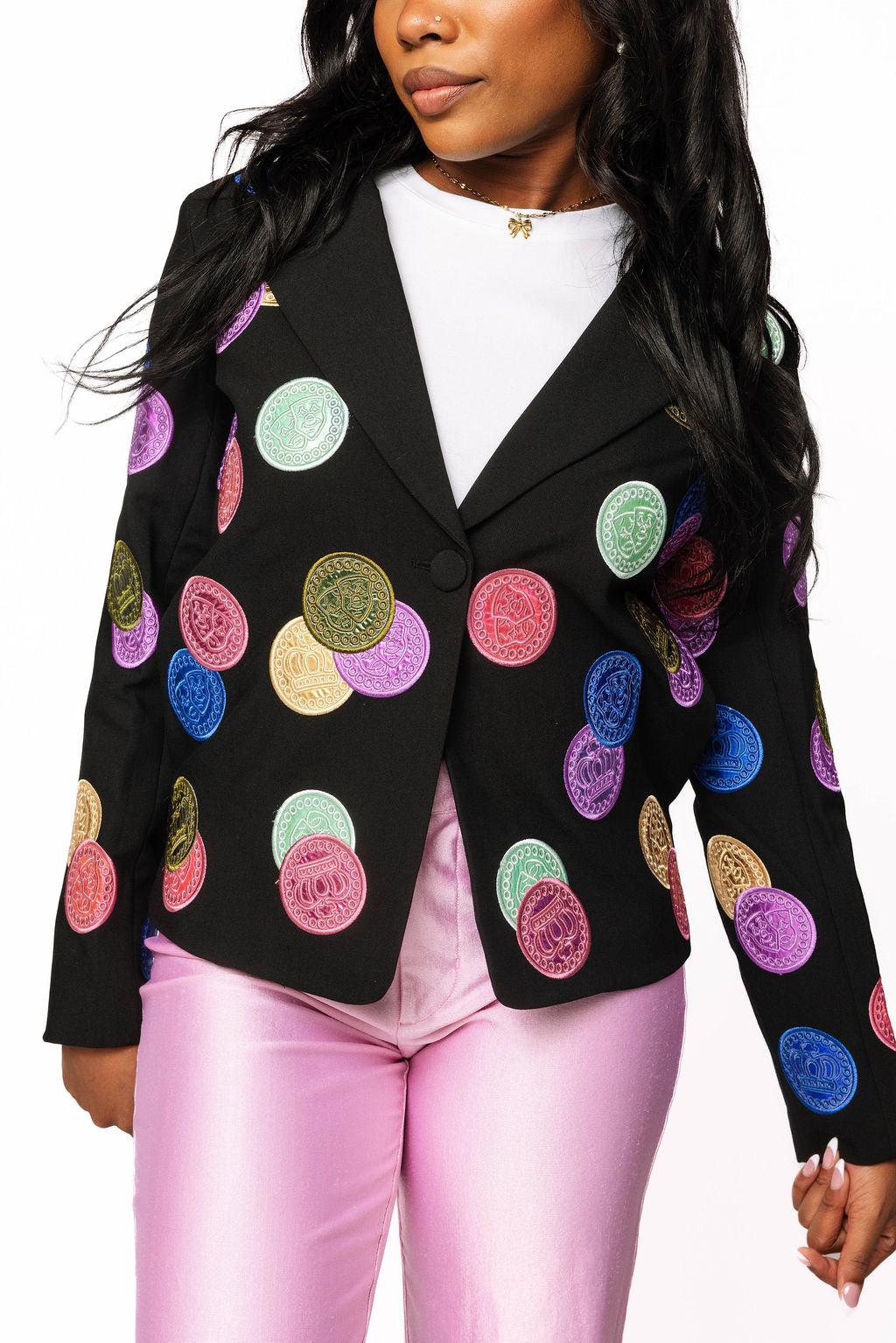 Black Multi Doubloon Blazer Strike gold with this show-stopping black blazer featuring a dazzling multi-doubloon design that catches the light from every angle. Perfect for turning heads at parties, events, or whenever you want to add serious sparkle to your wardrobe. The sleek black base keeps things sophisticated while those shimmering coin accents deliver all the glamour. Layer it over your favorite dress or pair it with tailored trousers for an instant upgrade. Because sometimes you don't just want to look good—you want to absolutely *shine*.
