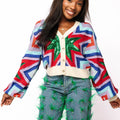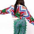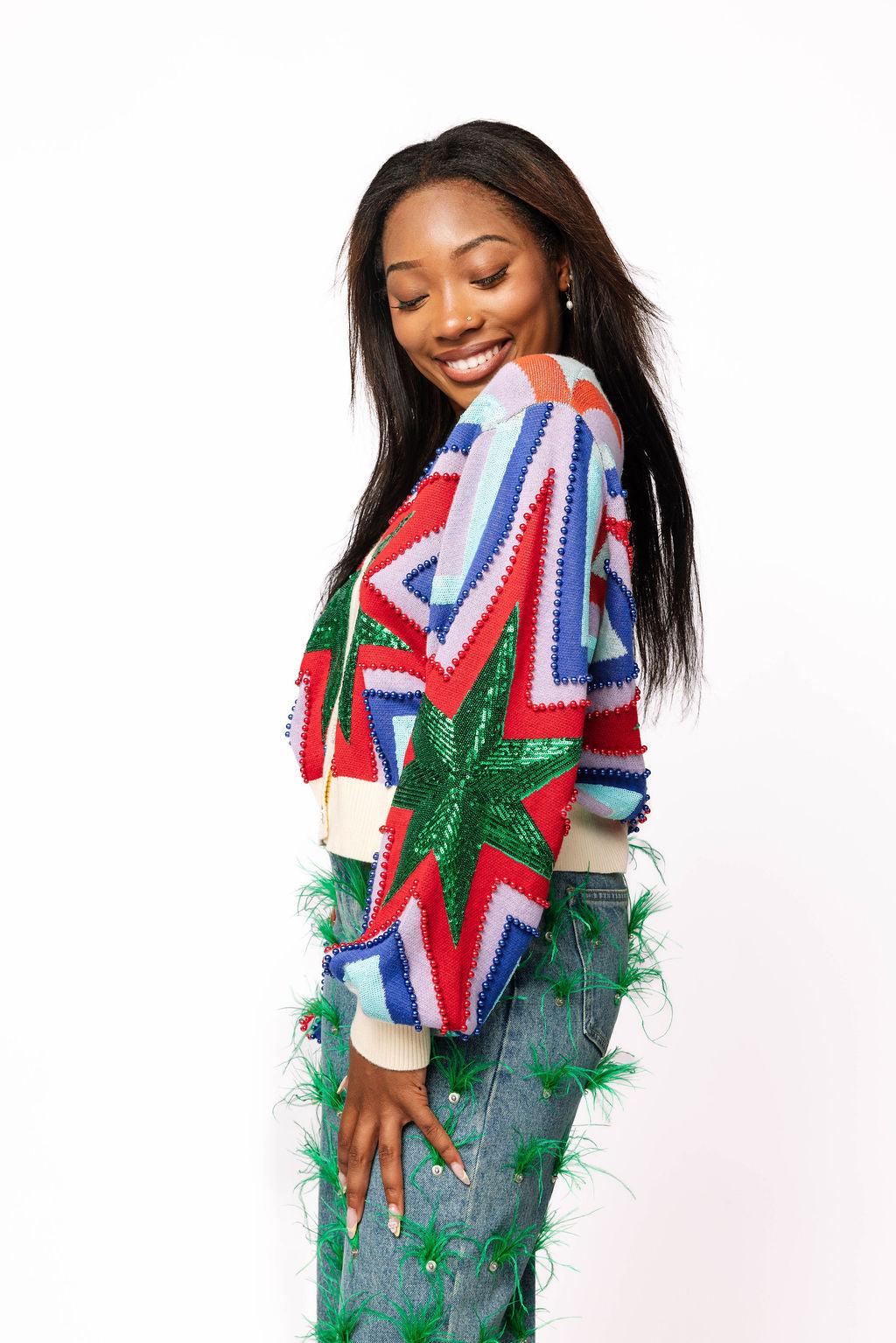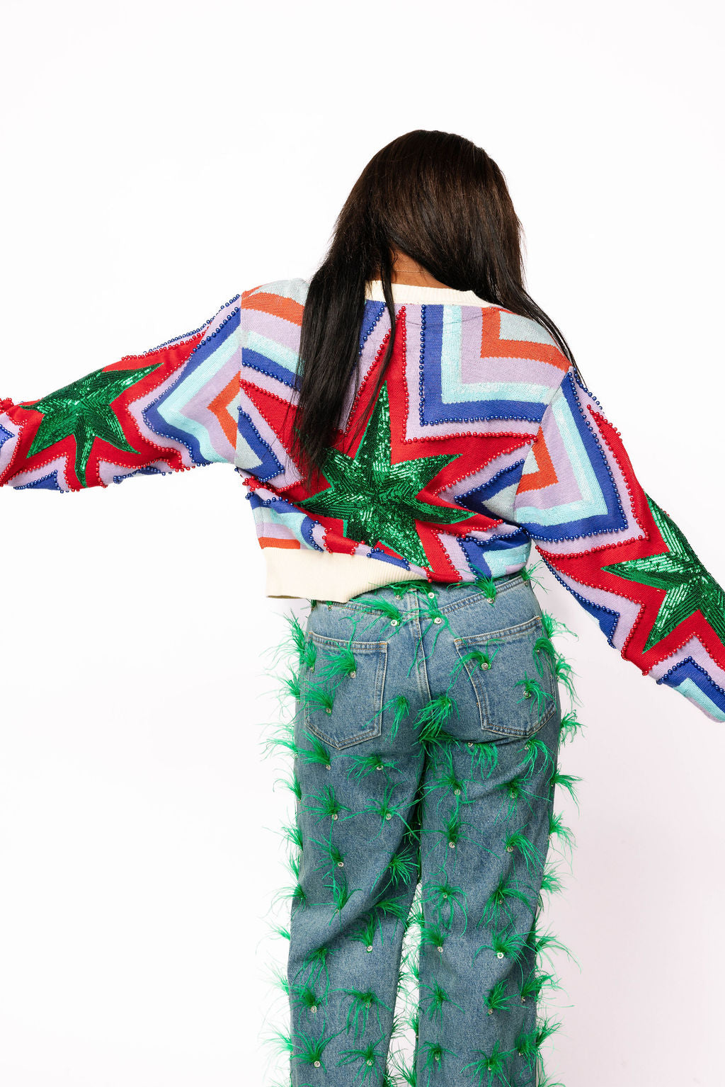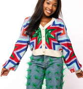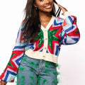 This playful cardigan lights up your outfit with vibrant starburst patterns in blue, red, green, and purple. Sparkling sequins add a dazzling touch at the center of each burst, making it perfect for those who love a fun, eye-catching style. Cozy and colorful, it’s a standout piece that brings joy to any wardrobe.