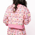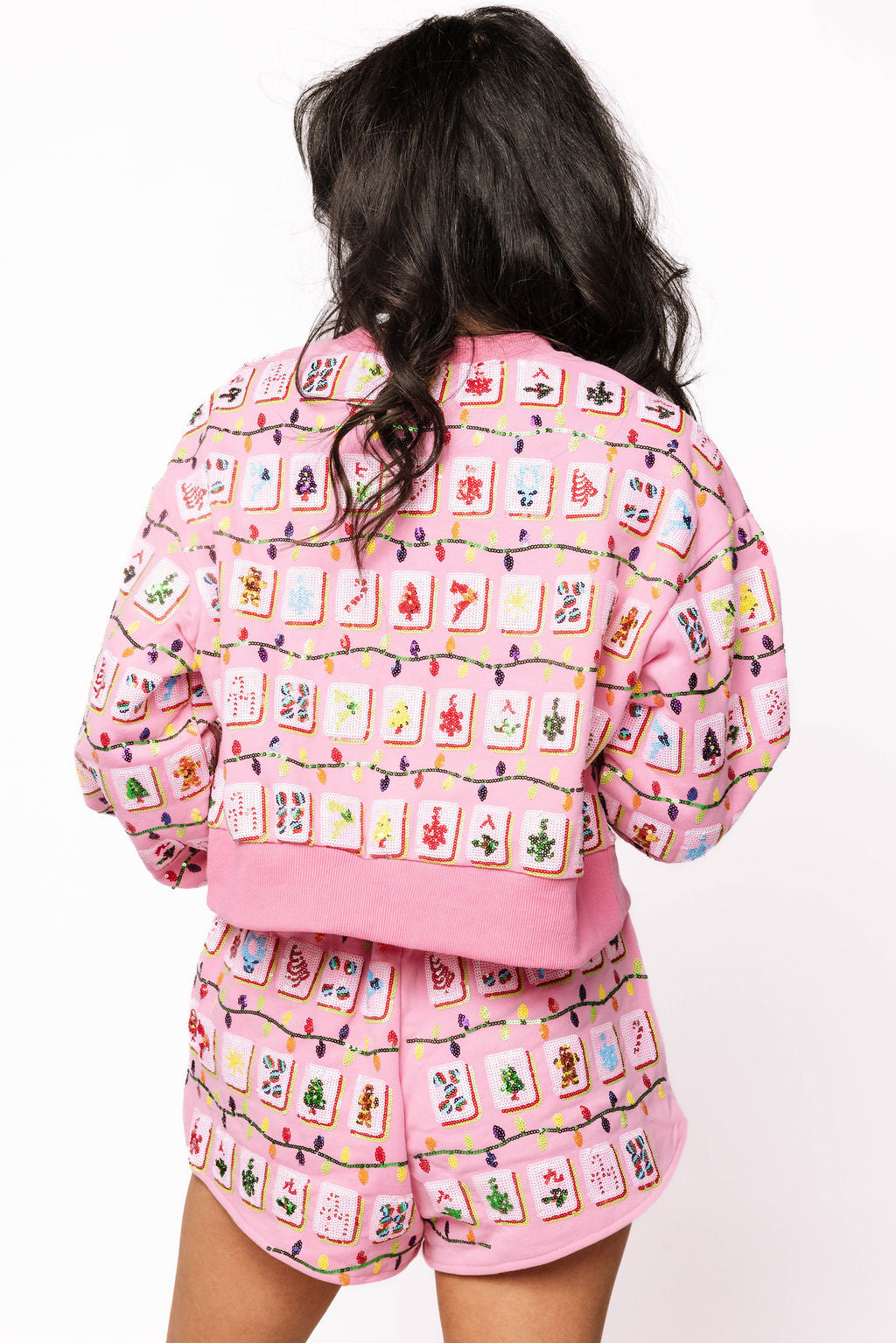 These playful pink shorts bring together festive cheer and unique style with a fun mahjong tile and Christmas light pattern. Perfect for holiday lounging or casual outings, they add a splash of whimsy and color to your wardrobe while keeping you comfortable all day long. Celebrate the season with a touch of sparkle and game night charm!
