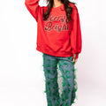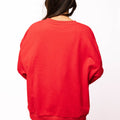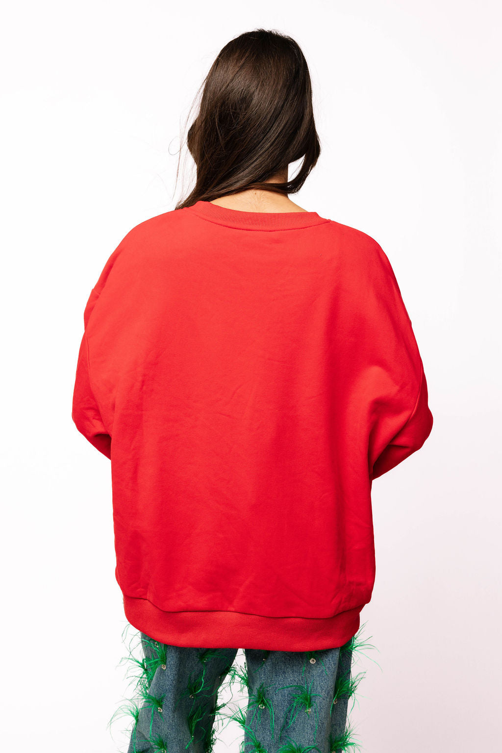 Bring festive cheer to your wardrobe with this playful oversized red sweatshirt, sparkling with rhinestones that spell out "Merry & Bright." Cozy and eye-catching, it’s the perfect holiday top to keep you comfortable while spreading joyful vibes all season long.