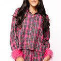 Add a fun twist to your wardrobe with this Pink Plaid Feather Sleeve Cotton Button Up Top. The soft cotton fabric keeps you comfy while the playful feathered sleeves bring a flirty flair. Its classic button-up design pairs perfectly with jeans or skirts for a look that's both casual and charming. Embrace effortless style with a touch of whimsy!