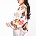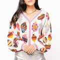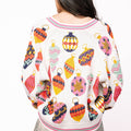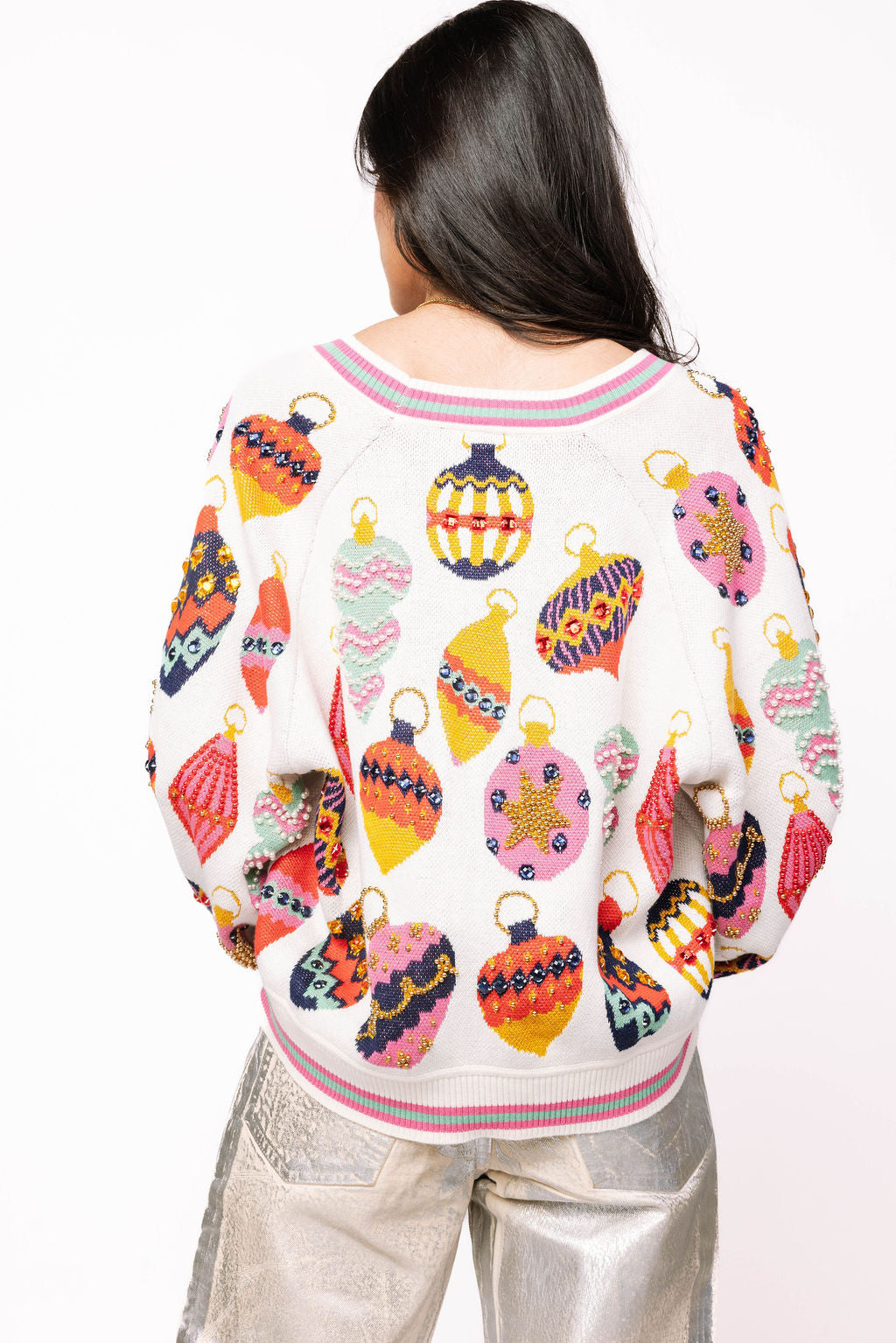 Add a splash of fun to your holiday wardrobe with this playful beige cardigan, adorned with vibrant, colorful ornaments on both front and back. Cozy and stylish, it’s perfect for brightening up any outfit while keeping you comfortably warm.