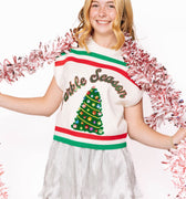 Celebrate the festive spirit with this playful white sweater, adorned with cheerful green and red stripes and a sparkling Christmas tree graphic. The "sparkle season" text adds a fun holiday touch, making it perfect for cozy gatherings.