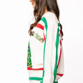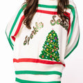 Celebrate the festive spirit with this playful white sweater, adorned with cheerful green and red stripes and a sparkling Christmas tree graphic. The "sparkle season" text adds a fun holiday touch, making it perfect for cozy gatherings. Pair it with the matching skirt to complete your joyful, festive look.