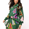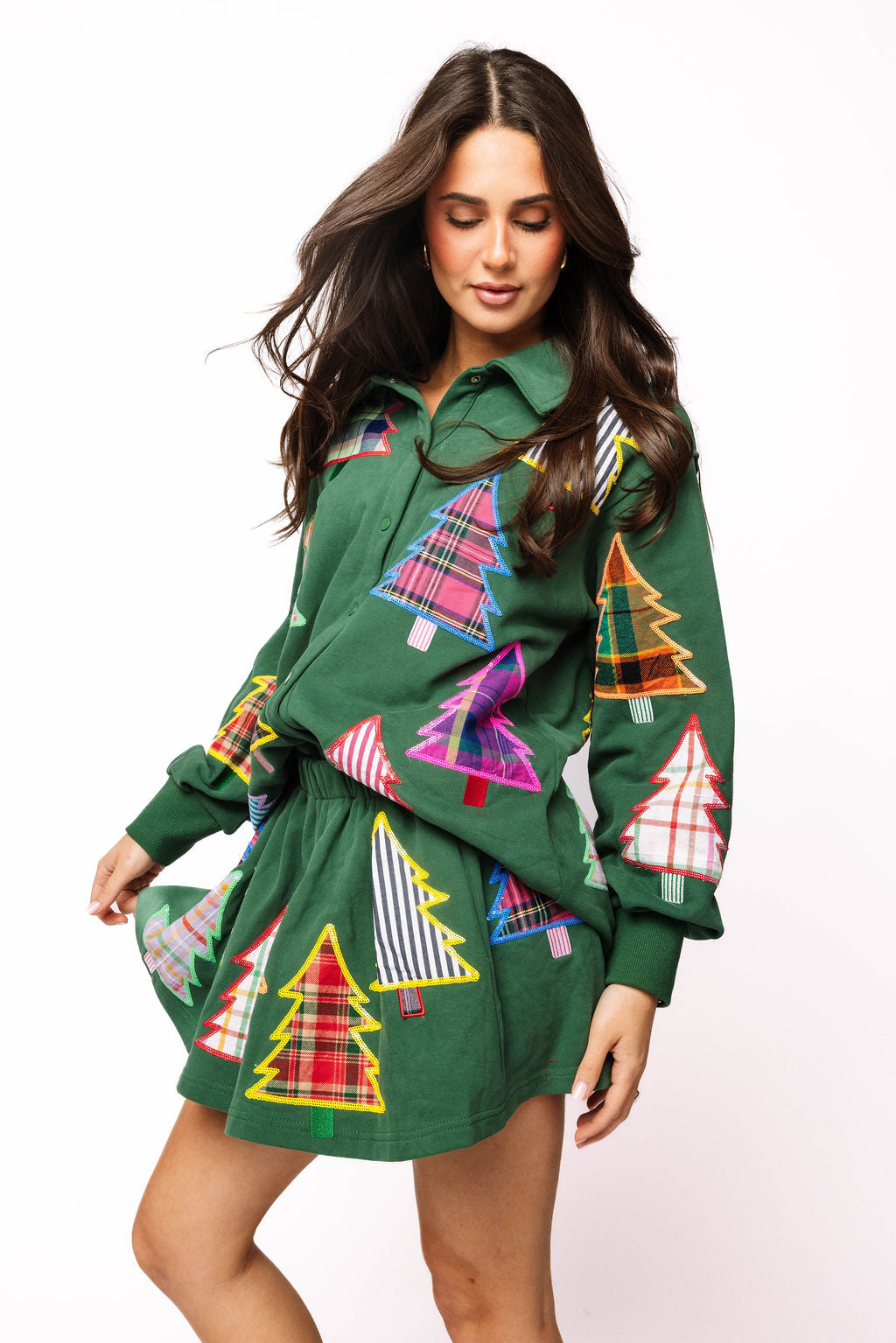 Celebrate the season in style with this Dark Green Multi Plaid & Stripe Christmas Tree Pleated Skort. Its festive plaid and stripe pattern, featuring charming Christmas tree accents, adds a playful twist to your holiday wardrobe. The pleated design brings fun movement and a flirty flair, perfect for holiday parties or cozy winter days. Pair it with your favorite sweater for a joyful look that embraces all the festive cheer.