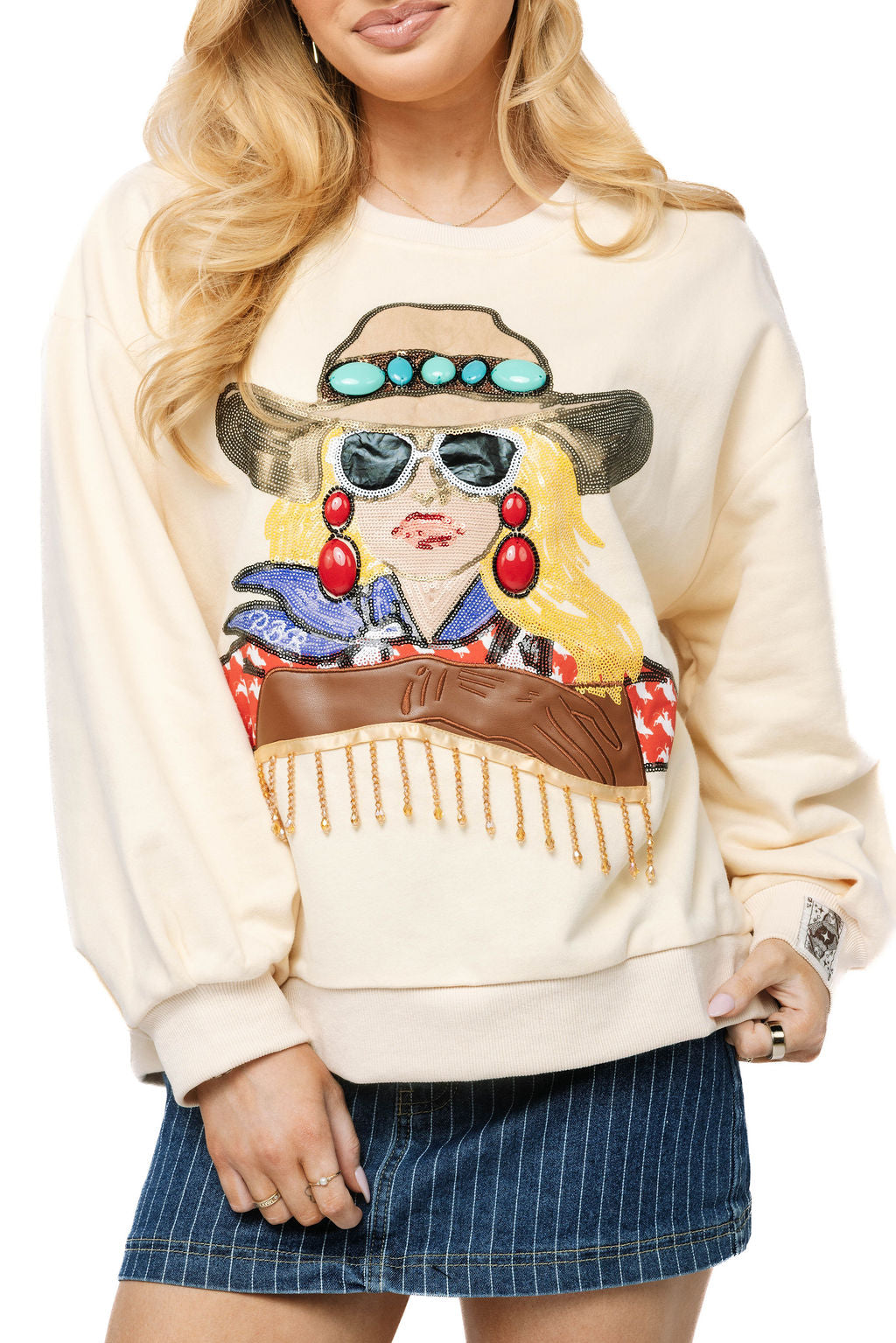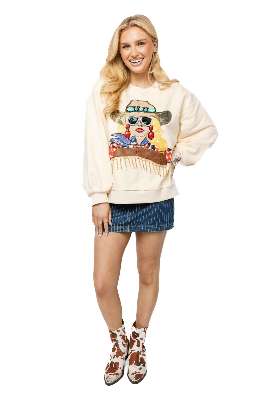 Rock the rodeo in this officially licensed PBR sweatshirt featuring a bold cowgirl graphic with faux leather gloves. Crafted in a cream colorway with eye-catching bull sleeve details, this piece delivers authentic Western vibes with a playful edge. The perfect rodeo fit means you'll move comfortably whether you're cheering from the stands or making your own statement. Celebrate your love of PBR and cowgirl culture with a sweatshirt that's as spirited as you are.