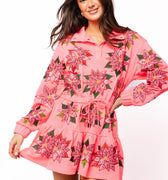 Neon Pink Poinsettia Button Up Mock Neck Tie Sweatshirt Dress