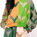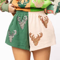 Embrace cozy vibes with these comfy shorts featuring a fun colorblock design and a sparkling sequin deer print. Perfect for lounging or casual days, they add a playful pop to your outfit. Match them with the coordinating sweatshirt for an effortlessly cute and comfy look that’s ready for any chill moment.