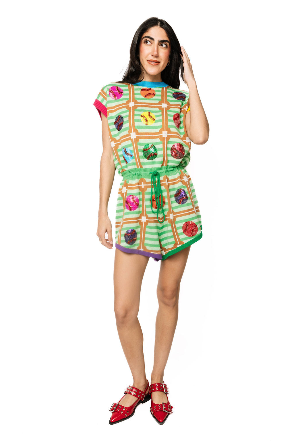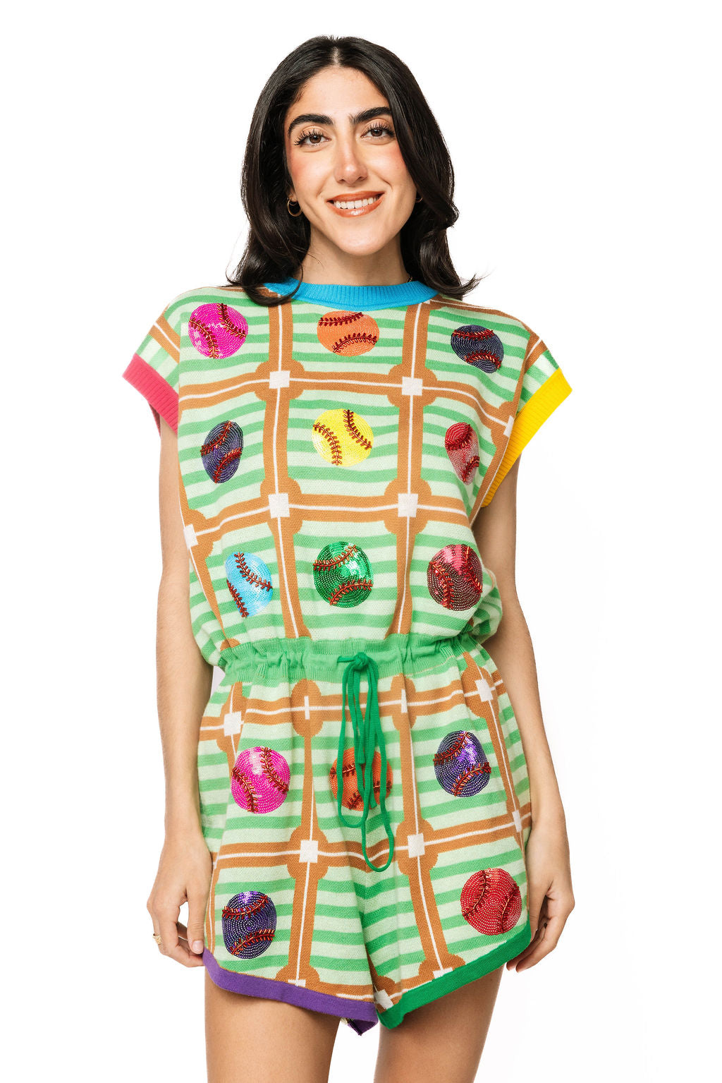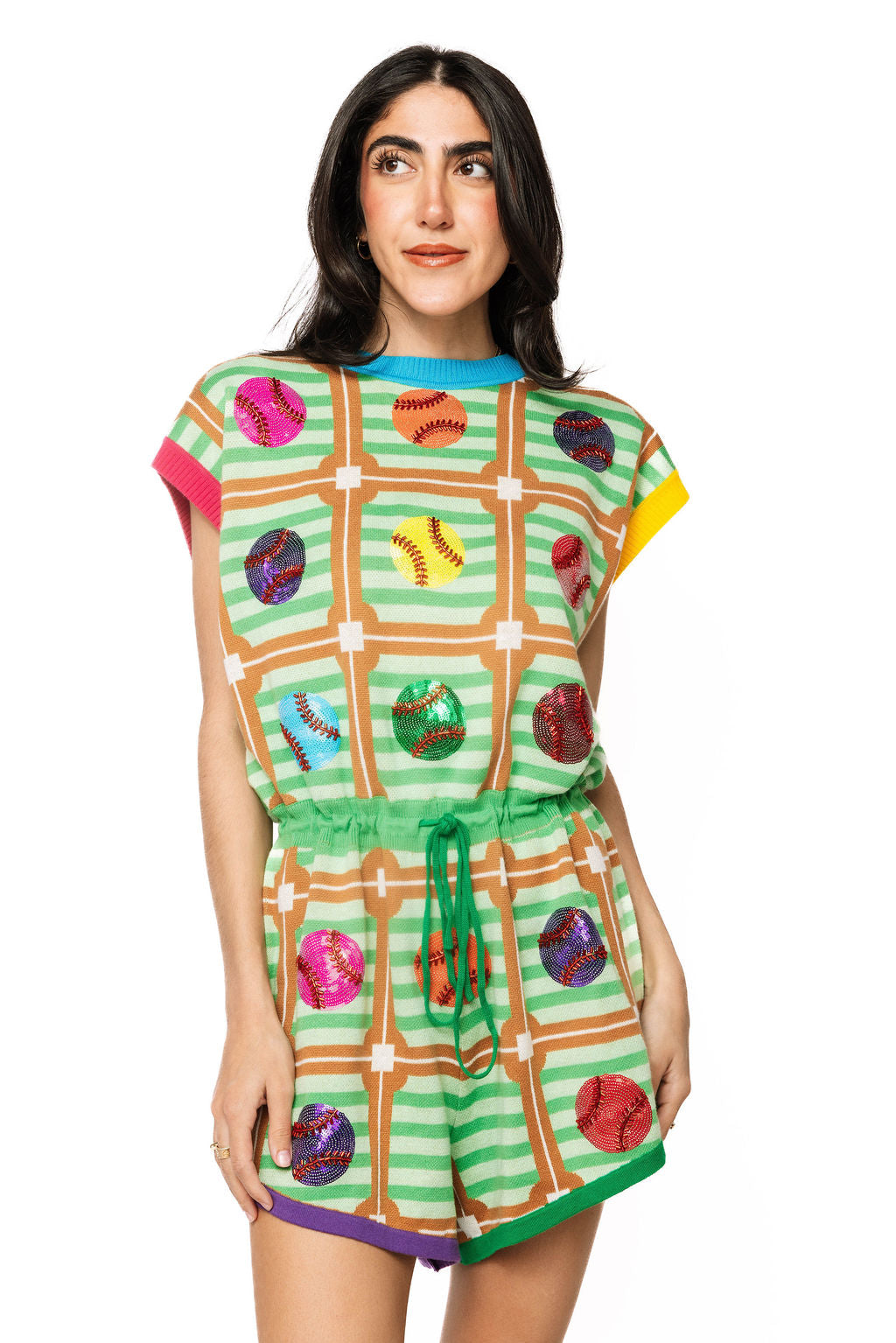 Step up to the plate in this vibrant knit romper that celebrates your love of the game. Featuring eye-catching multicolor baseball designs across a playful mint base, this midi-length piece brings sporty style to any occasion. The adjustable tie waist creates a flattering silhouette while the soft knit fabric ensures all-day comfort. Perfect for game day, casual outings, or anyone who wants to wear their passion for baseball with confidence and flair.