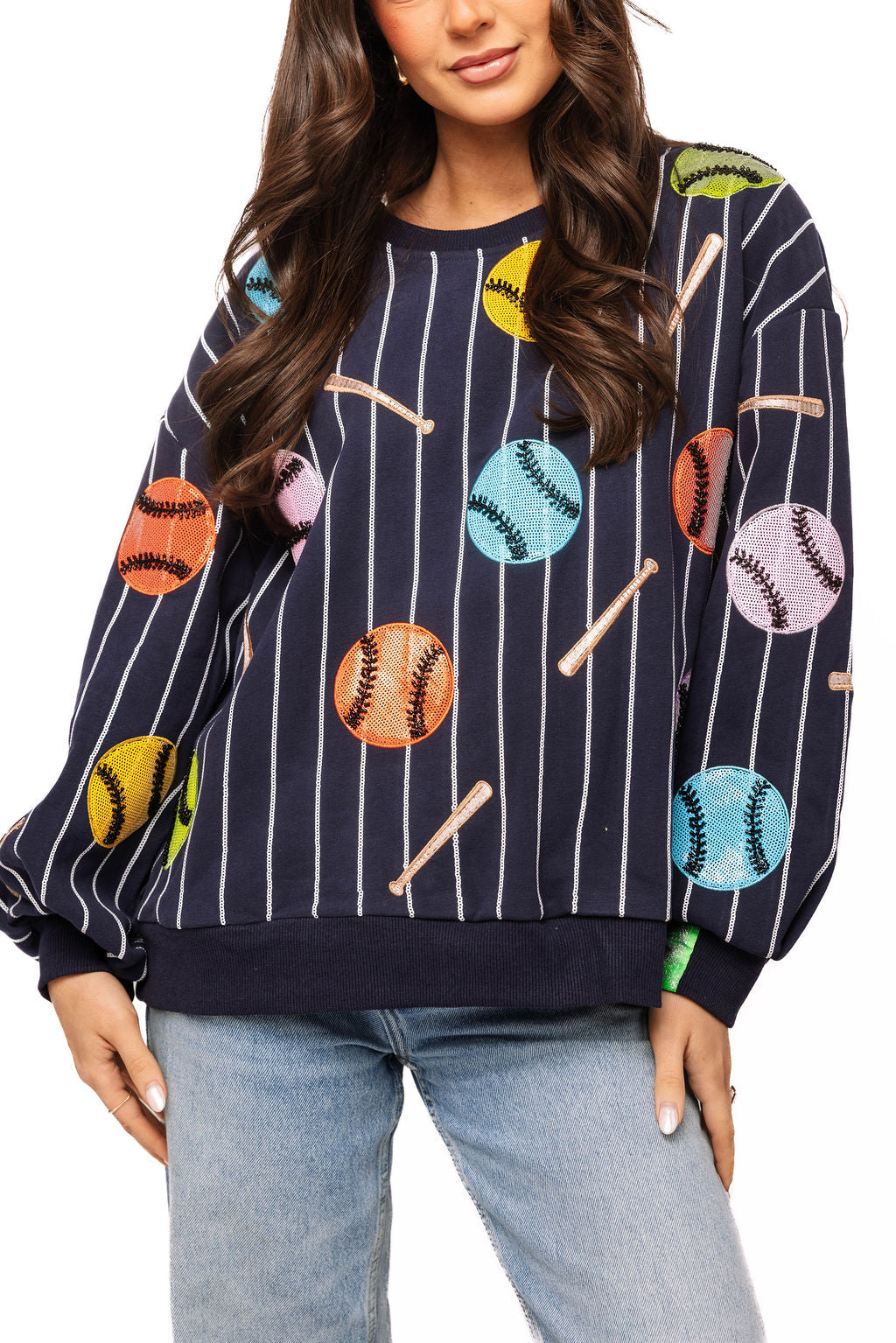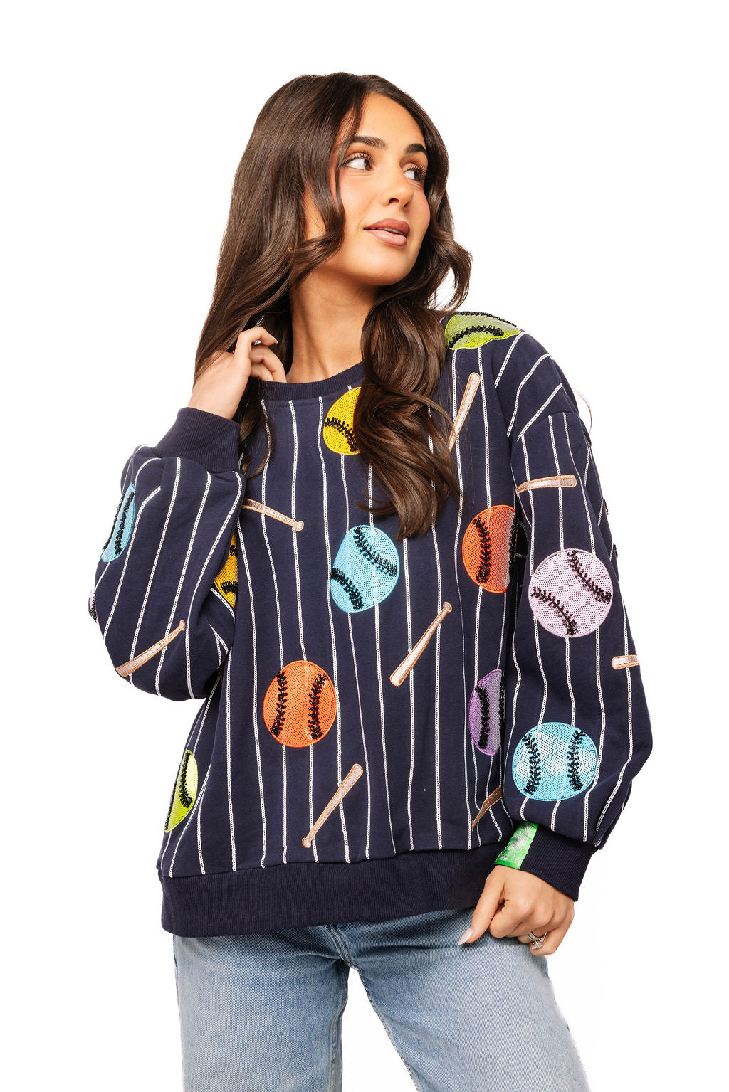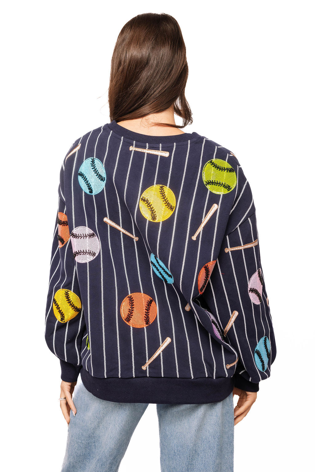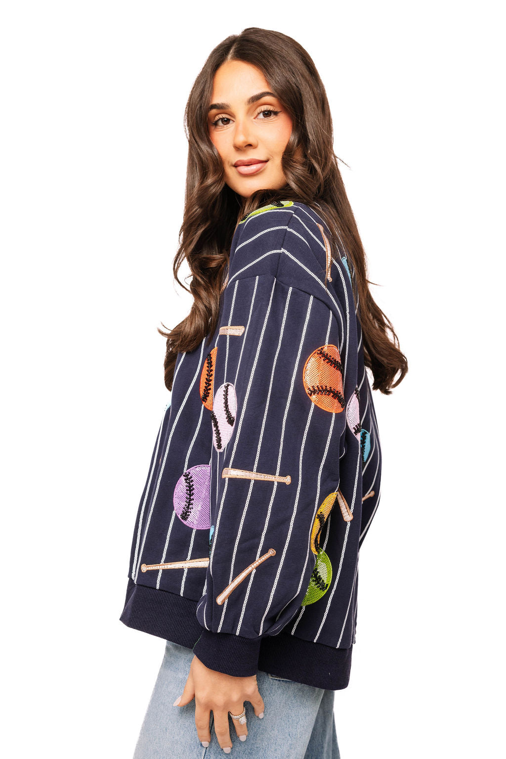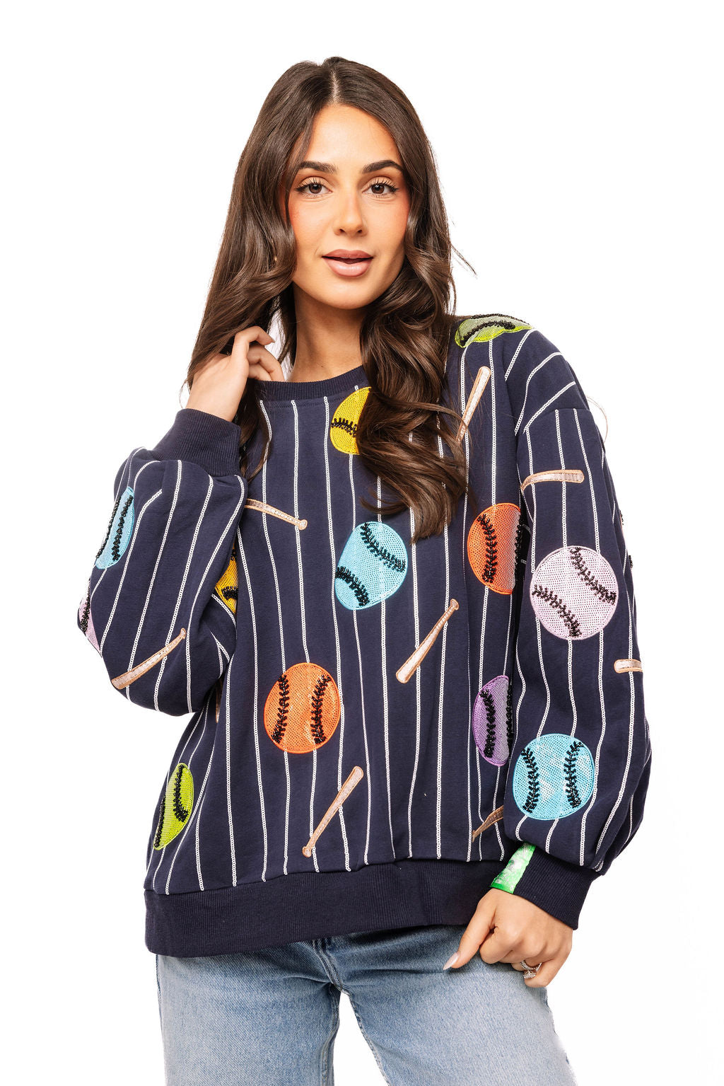 Swing into style with this navy and white striped sweatshirt featuring a vibrant multi-color baseball and bat design. Perfect for game day or casual wear, this playful piece combines classic stripes with sporty flair. The colorful baseball graphics add personality and charm, making it a fun addition to any wardrobe. Comfortable and eye-catching, it's ideal for fans who love to show their love of the game in style.
