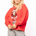 Celebrate the season in cozy style with this red oversized sweatshirt featuring a playful Santa Nutcracker design. Decorated with shimmering metallic accents and sparkling sequins on both front and back, it adds festive fun from every angle. Perfect for staying warm while spreading holiday cheer with a touch of sparkle!