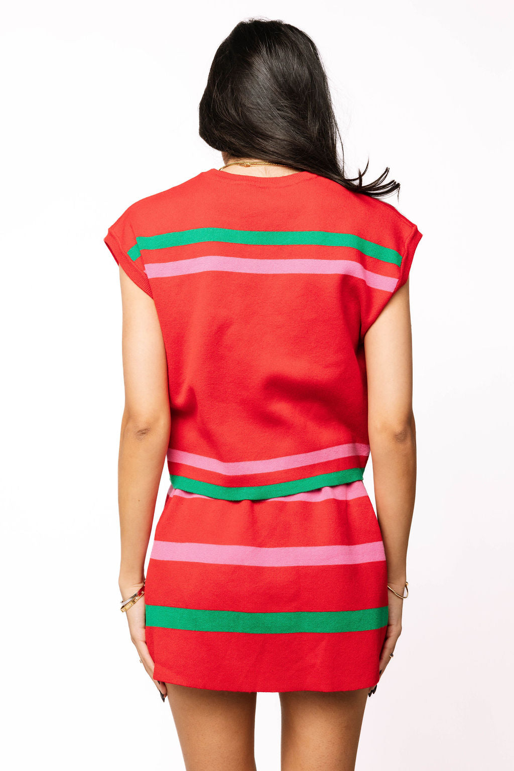 Celebrate the season in style with this slightly oversized Red, Green & Pink 'Sleigh Queen' Stripe Top. Featuring a sparkling sequin Santa and bold "Sleigh Queen" lettering, it’s the perfect festive statement for holiday gatherings. Cozy and fun, it pairs effortlessly with the matching skirt to complete your merry look.
