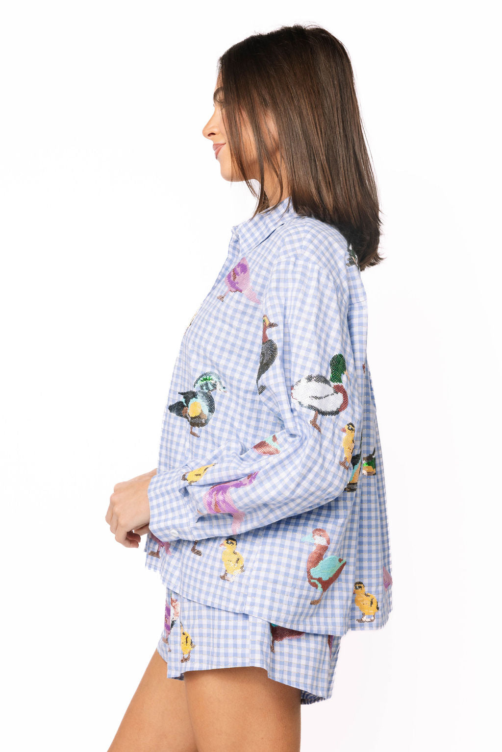 Make a splash this season in these charming blue and white gingham shorts featuring playful sequin ducks scattered across the front and back. The classic gingham pattern pairs perfectly with our matching shirt, creating an effortlessly coordinated look that's perfect for festivals, parties, or casual outings. The eye-catching sequin details add just the right amount of sparkle and personality to elevate your everyday style. Mix and match with the coordinating pieces to build your complete ensemble.