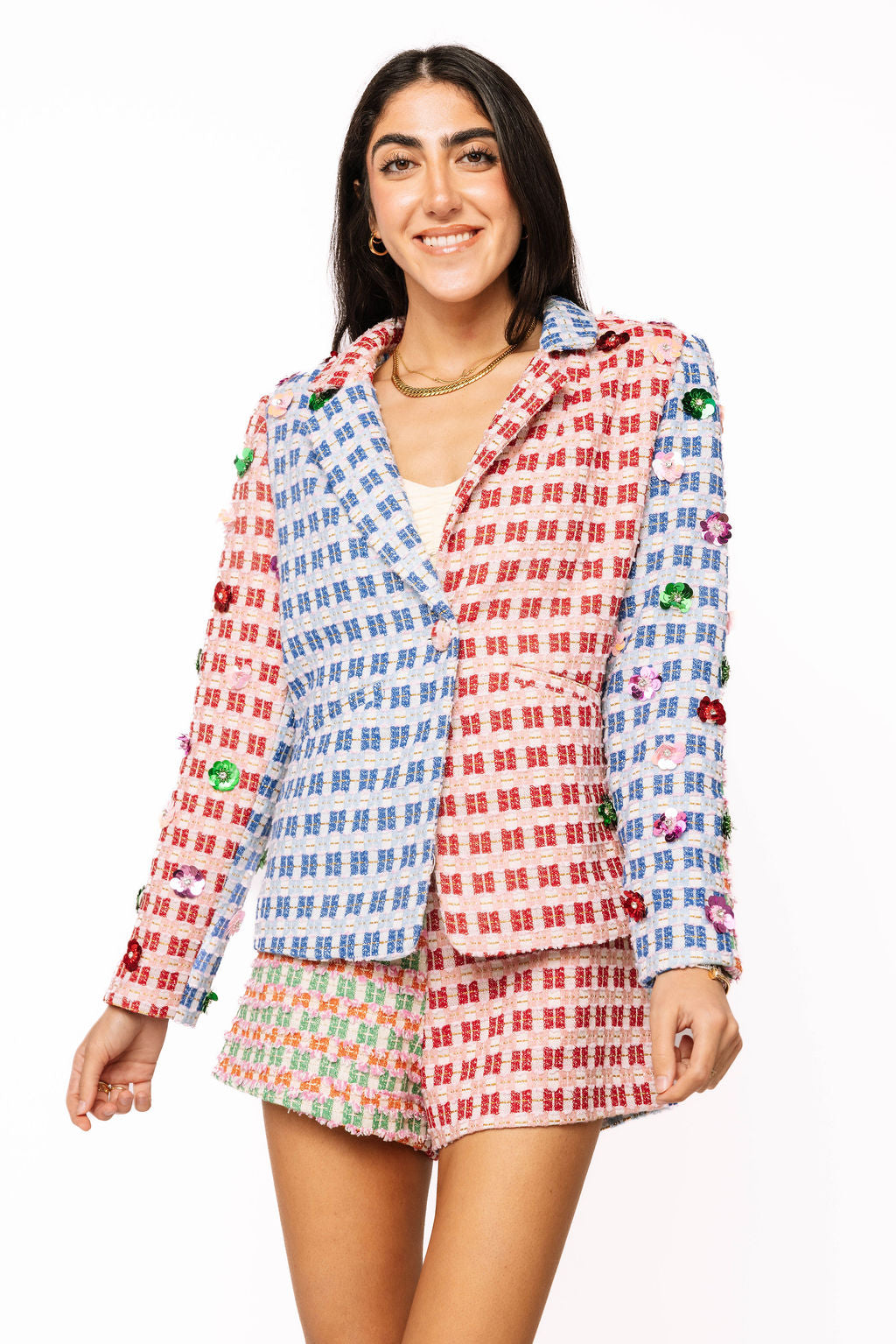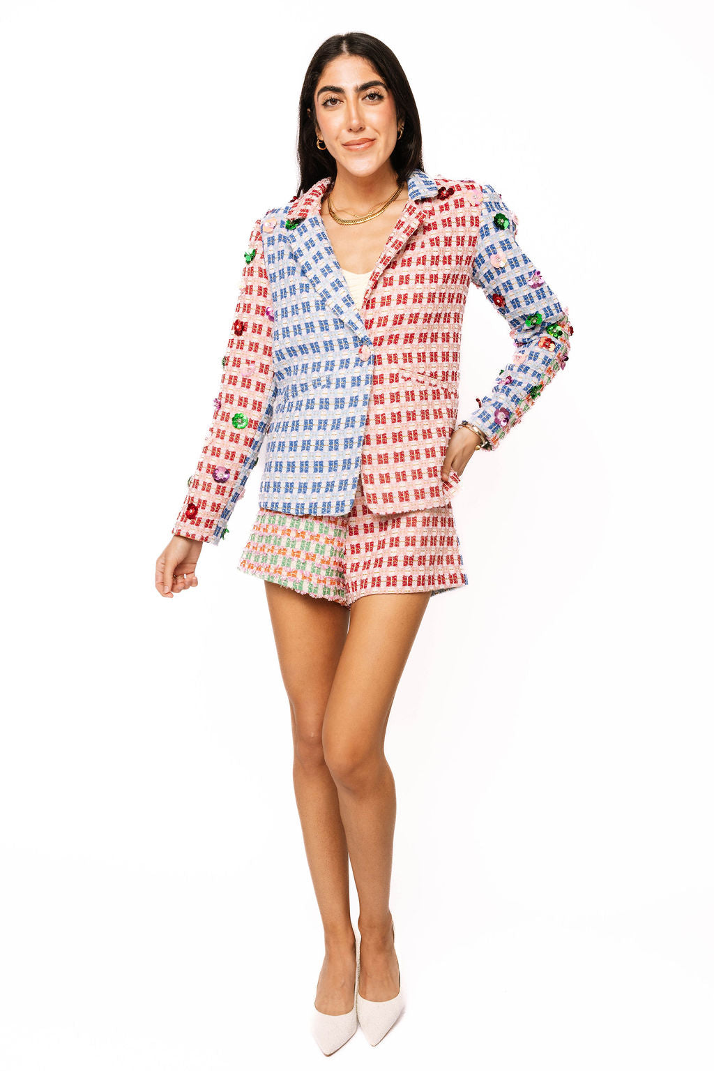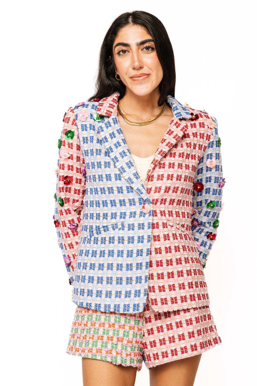 Elevate your spring wardrobe with these eye-catching colorblock tweed shorts. The dynamic color-blocking design brings modern flair to a classic tweed fabric, perfect for creating polished, put-together looks. Pair with the matching blazer to craft a coordinated ensemble ideal for Easter celebrations, garden parties, or any spring occasion. Whether styled as a complete set or mixed with your existing pieces, these shorts deliver versatile sophistication with undeniable style impact.