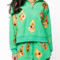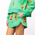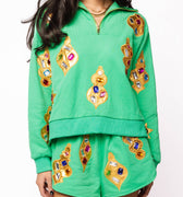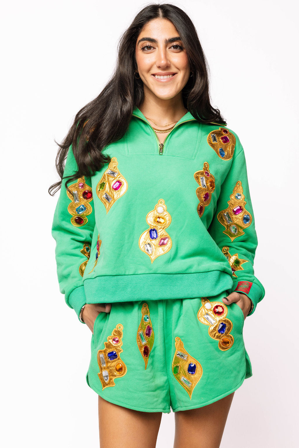 These Green & Gold Jeweled Ornament Shorts bring a fun pop of color with a comfy elastic waistband for the perfect fit. The sparkling gold ornament details add a touch of glam, making them ideal for lounging or stepping out. Pair with the matching sweatshirt to complete your stylish, coordinated look and turn heads wherever you go!