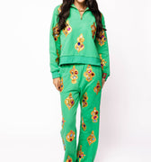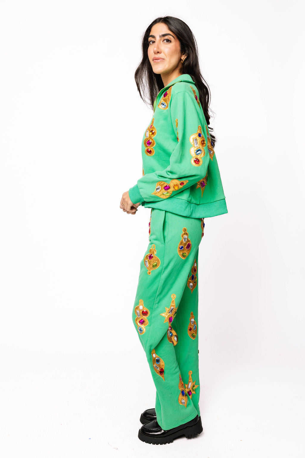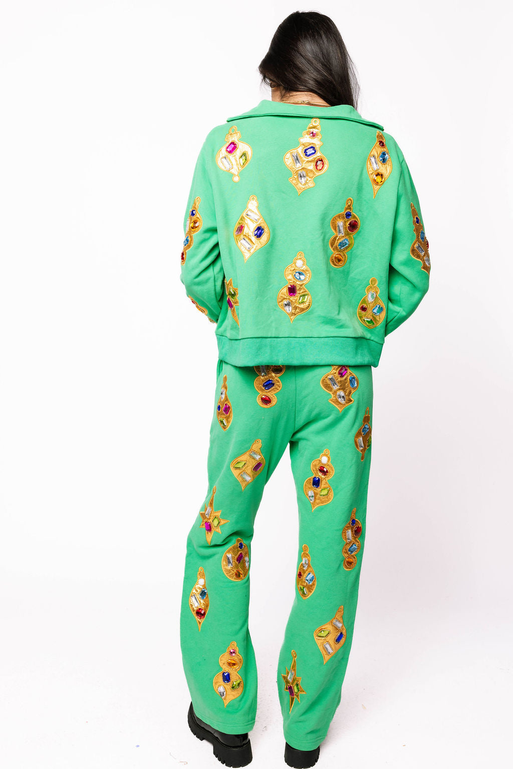 These Green & Gold Jeweled Ornament Sweatpants bring a fun pop of color with a comfy elastic waistband for the perfect fit. The sparkling gold ornament details add a touch of glam, making them ideal for lounging or stepping out. Pair with the matching sweatshirt to complete your stylish, coordinated look and turn heads wherever you go!