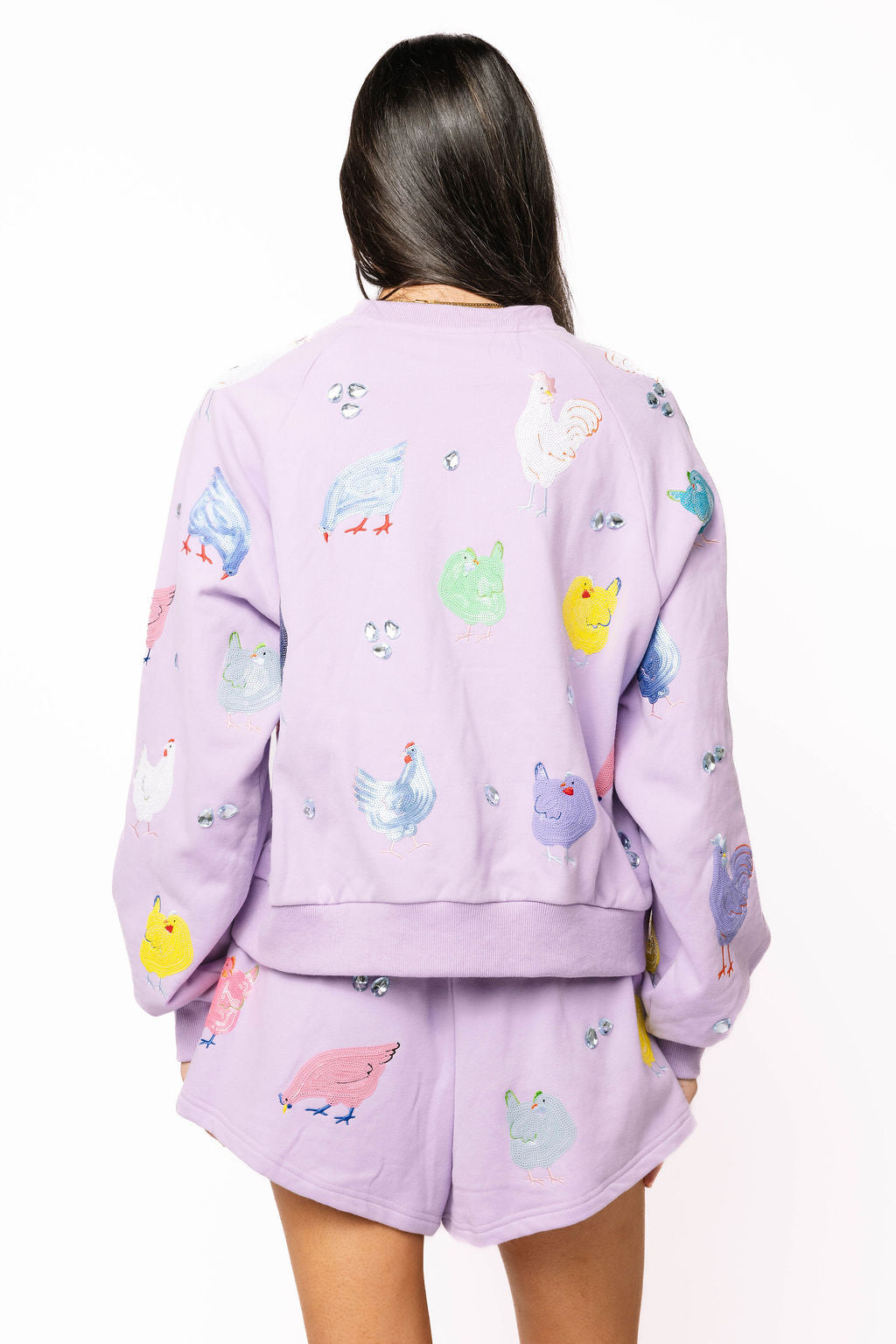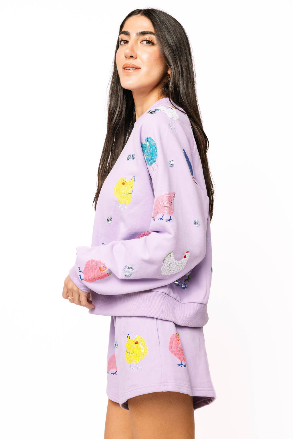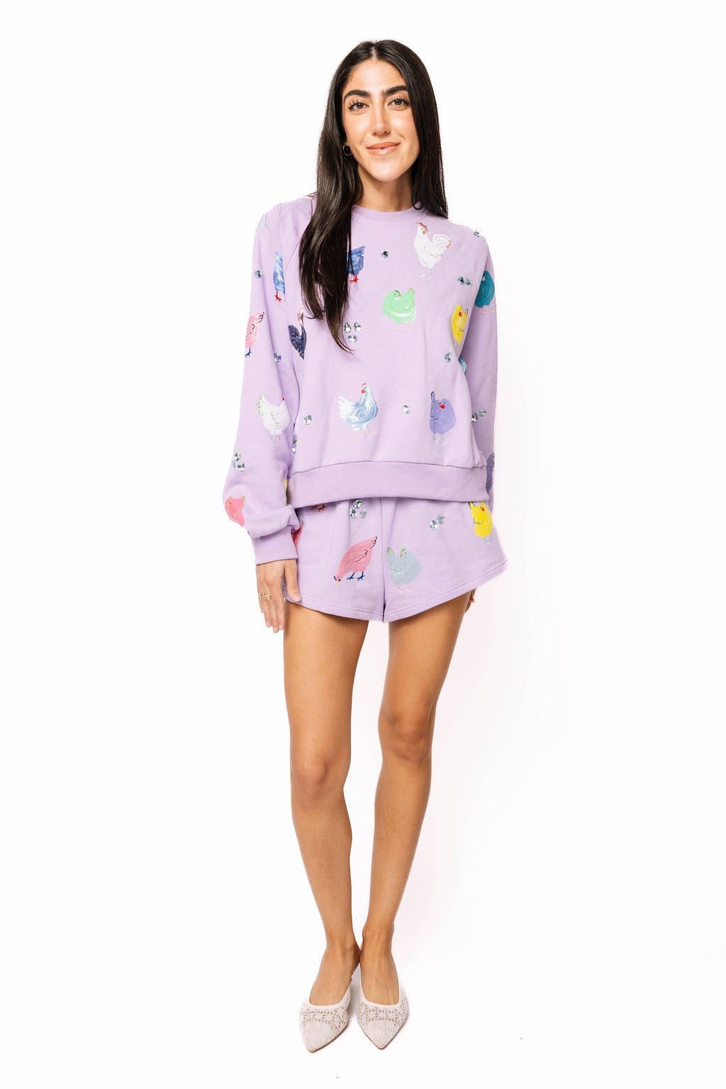 Get ready to turn heads this spring in these lavender shorts featuring a vibrant multi-color chicken design adorned with sparkling rhinestone eggs. The comfortable elastic waist keeps you moving all day long. Elevate your look by pairing these playful shorts with the matching sweatshirt for a coordinated set that radiates fun and style. Perfect for anyone who embraces bold, whimsical fashion, this duo delivers comfort and personality in every wear. Make spring unforgettable with this eye-catching ensemble.