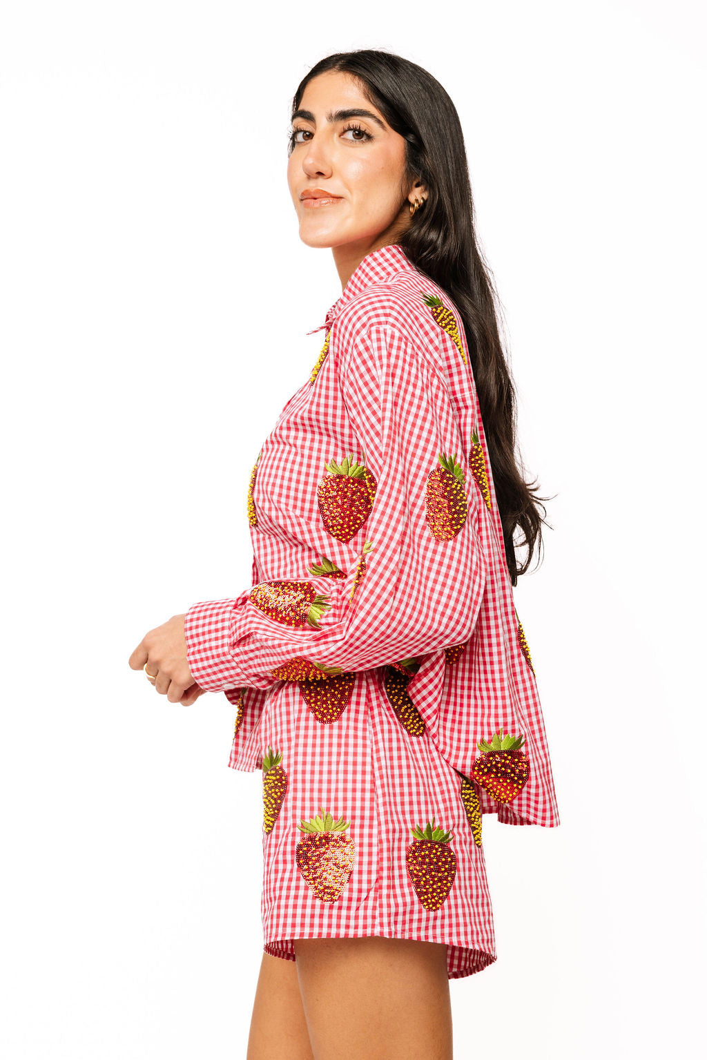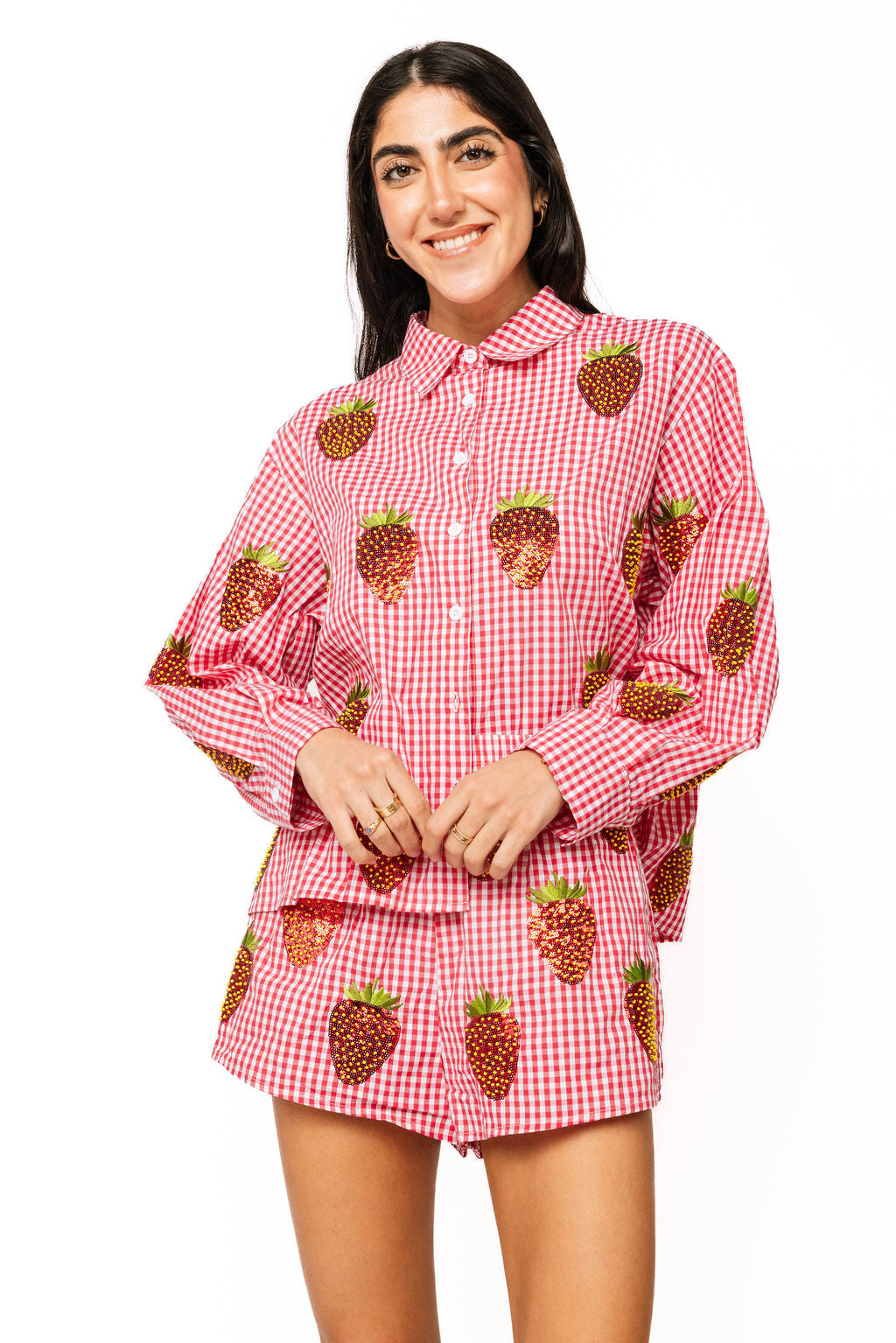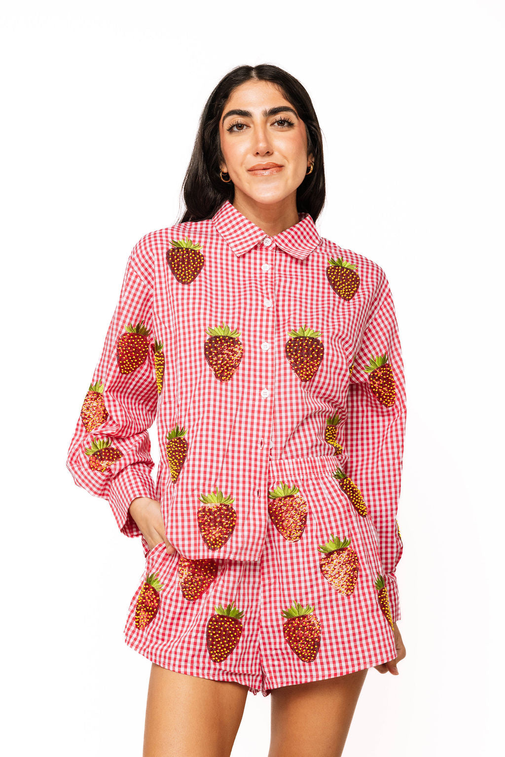 Elevate your summer wardrobe with this charming red and white gingham button-up top, adorned with eye-catching sequin strawberries scattered across the front and back. Crafted from soft cotton with long sleeves, this playful piece brings whimsical style to any outfit. The beaded strawberry details add a touch of sparkle and personality that stands out from the ordinary. Style it with our matching shorts for a coordinated, Instagram-worthy look that celebrates fun fashion. Perfect for those who dare to shine with confidence and flair.