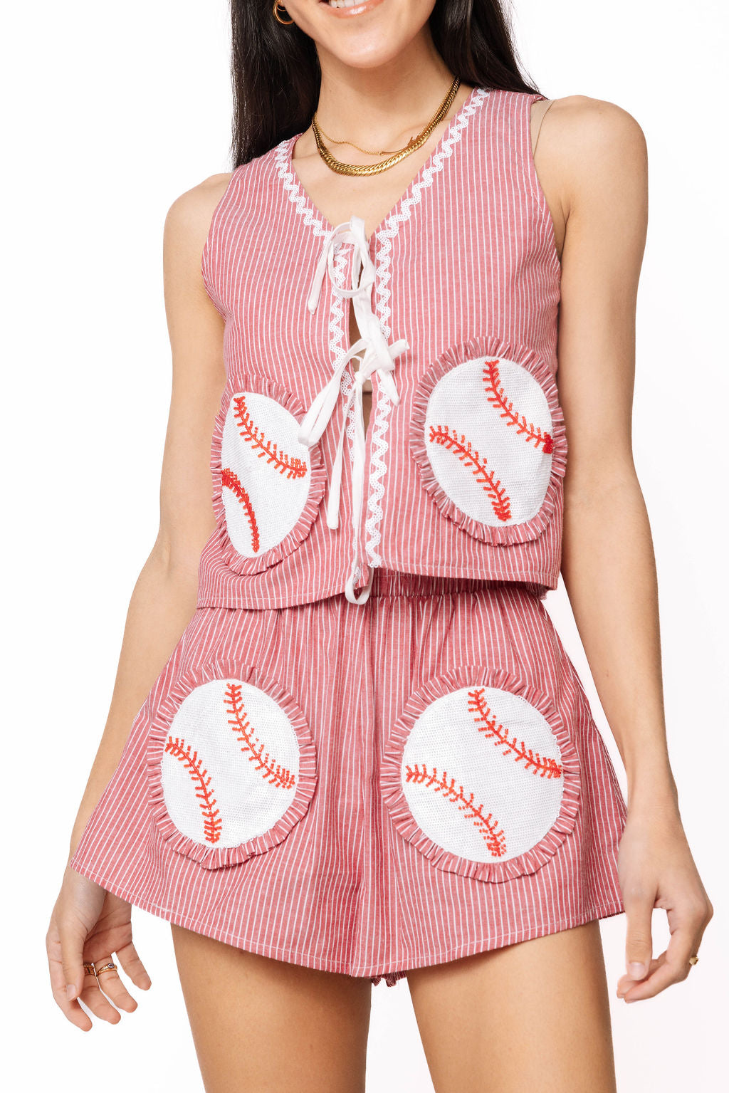 Stripes meet sparkle in this playful tank that's ready to steal the show. The classic red and white striped design gets a fun twist with a tie-front detail that lets you customize the fit, while the sequin baseball graphics adds just the right amount of shimmer. Perfect for game day, casual outings, or whenever you want to bring some personality to your wardrobe. Soft cotton keeps you comfortable all day long.