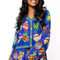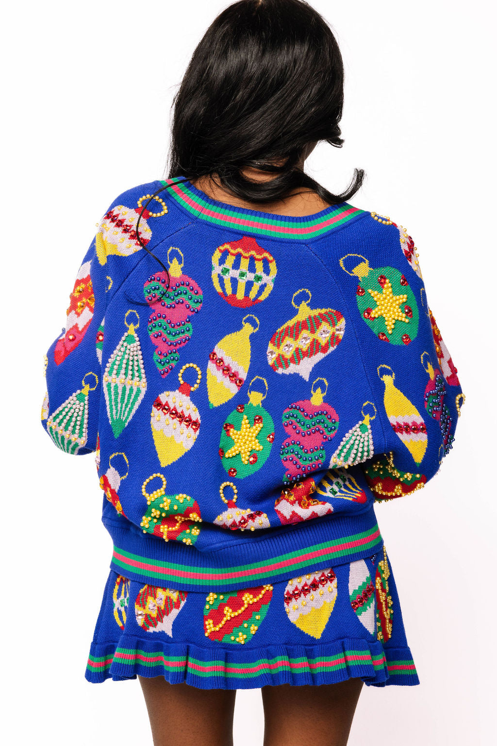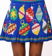 Celebrate the season in style with this royal blue skirt adorned with vibrant, colorful ornaments. Its lively design brings festive cheer to any outfit, while the rich blue hue adds a touch of elegance. Pair it with the matching cardigan for a playful, coordinated look that’s perfect for holiday parties and joyful gatherings.