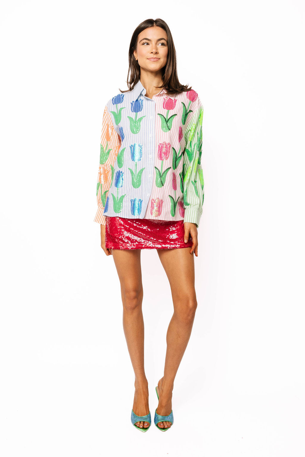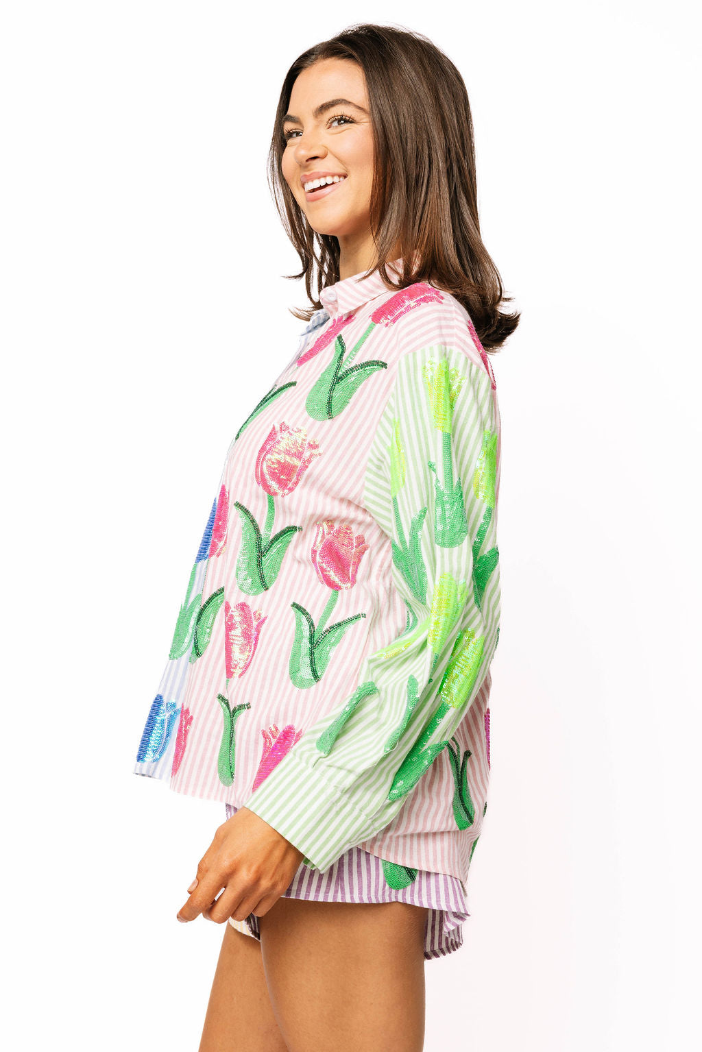 Make a statement with this striped colorblock button-up that combines playful style with eye-catching detail. Shimmering sequin tulips dance across the front and back, adding dimension and sparkle to your everyday wardrobe. The long sleeves and classic button-front design keep things polished while the vibrant color blocking ensures you'll stand out. Crafted from soft cotton for all-day comfort, this top pairs perfectly with the matching shorts to create a coordinated look that's equal parts fun and fashion-forward.