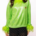 Celebrate the season in style with this playful green sweater that sparkles from head to toe. Covered in shimmering sequins and accented with soft feather trim at the collar and cuffs, it’s a festive nod to the Grinch’s iconic heart-growing moment. Perfect for holiday parties or cozy winter fun, this sweater brings bold sparkle and cheeky charm to your seasonal wardrobe.