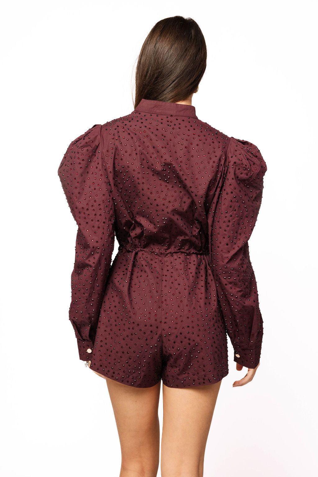 Elevate your style with this playful maroon romper featuring sparkling rhinestones on both front and back. The puff sleeves add a flirty, fun touch, while the gold zipper and front ties give it a chic, modern twist. Perfect for turning heads day or night with comfortable long sleeves and eye-catching details.