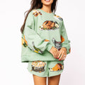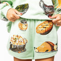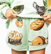 Celebrate Thanksgiving in style with the Mint Queen of Turkey Short! These playful mint sweatshirt shorts feature sparkling sequin designs of classic Thanksgiving dishes, adding a festive touch to your outfit. Perfectly paired with the matching sweatshirt, they create a cozy and fun look for holiday lounging or casual gatherings. Enjoy comfort and sparkle all season long!