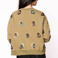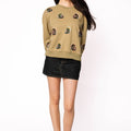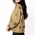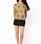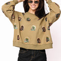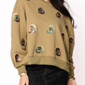 Cozy up in this playful olive green sweatshirt, sprinkled with sparkling sequin turkeys on both front and back. Its slightly oversized fit ensures comfort and a laid-back vibe, perfect for adding festive fun to your fall wardrobe.