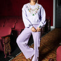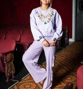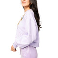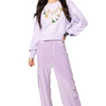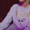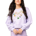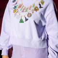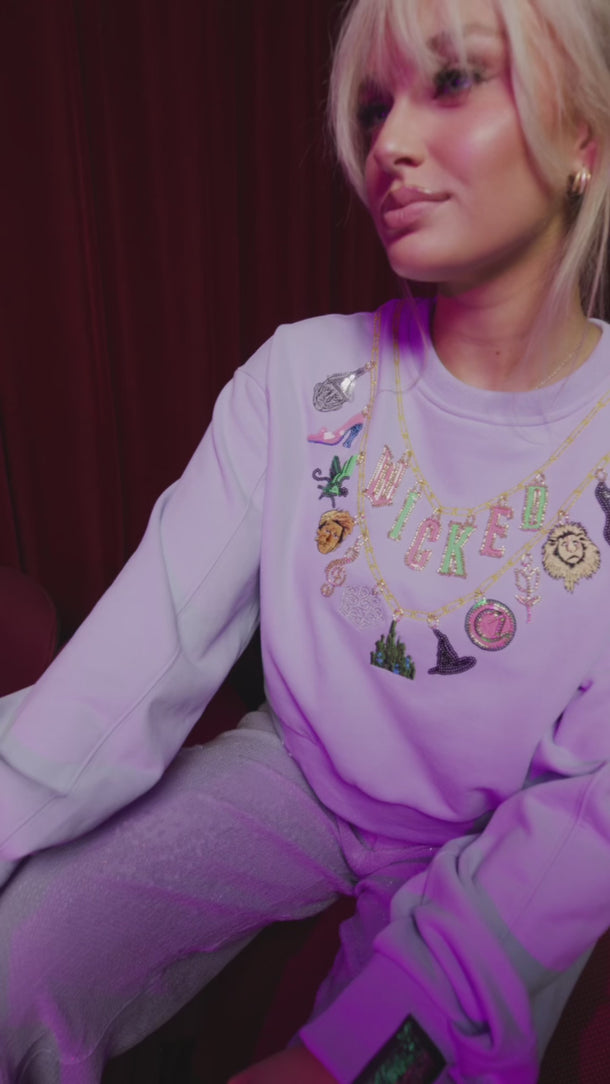 This cozy lavender sweatshirt features a printed charm necklace design showcasing iconic symbols and characters from the Wicked film, bringing a whimsical touch of sparkle to your look. Slightly cropped with a true-to-size fit, it’s the perfect way to wear your magic close to your heart.
