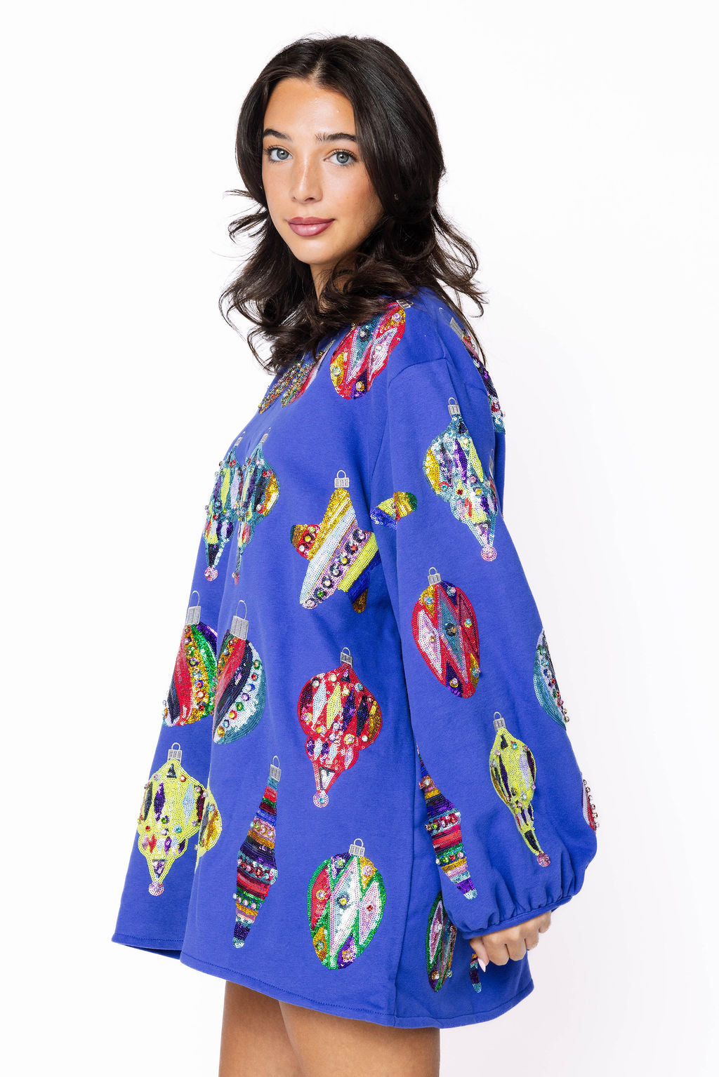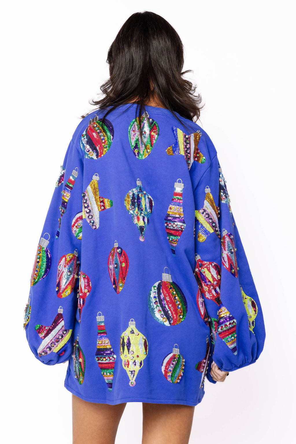 Bring sparkle to every celebration with this stunning blue dress adorned with shimmering sequin ornament designs throughout. Its long balloon sleeves add a whimsical touch, creating a festive and fun look perfect for parties or special occasions. Embrace your playful side and shine bright in this eye-catching statement piece.