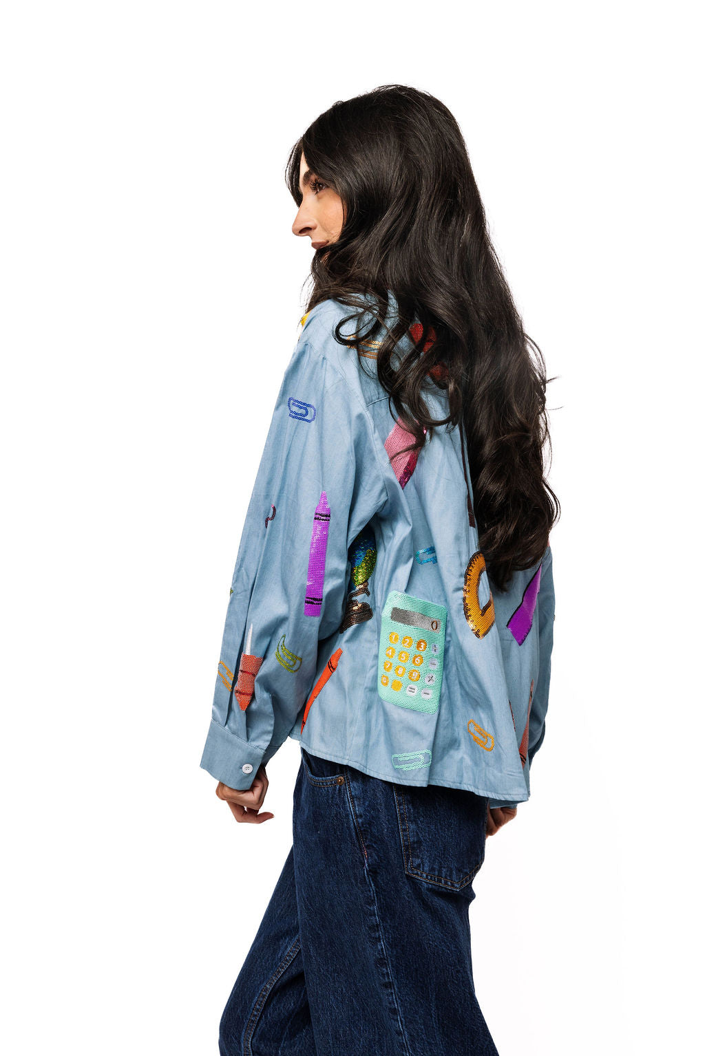 Celebrate your love of teaching with this playful denim button-up top! Covered in cheerful teacher icons—crayons, rulers, calculators, apples, and more—this piece brings classroom charm to your everyday style. The standout feature? A vibrant red gingham collar that adds a fun pop of color and personality. Perfect for educators who want to wear their passion, this top combines comfort with whimsical details that spark conversation. Whether you're in the classroom or out and about, it's a spirited way to show your dedication to education.