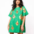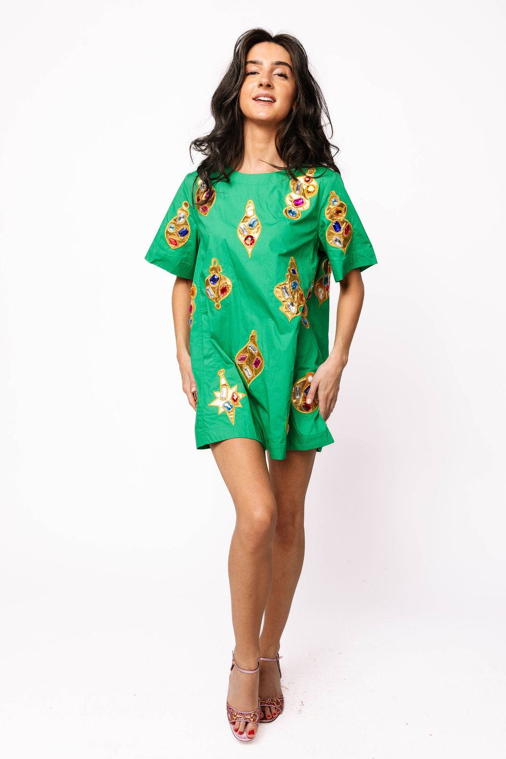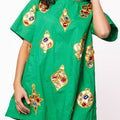 Elevate your style with this playful Green & Gold Jeweled Ornament Cotton Dress. Featuring a breezy short sleeve design and vibrant jeweled ornament patterns, it’s perfect for adding a pop of festive charm to any day. Crafted from soft cotton, it keeps you comfortable while turning heads. Ideal for casual outings or joyful gatherings, this dress combines fun and elegance effortlessly.