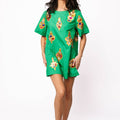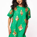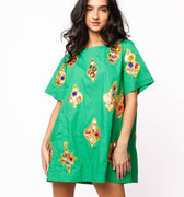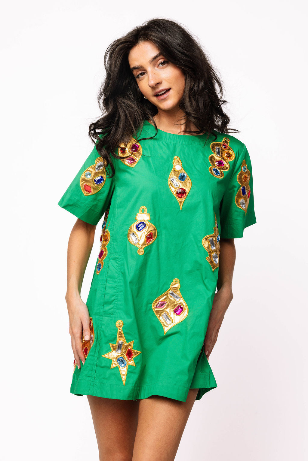 Green & Gold Jeweled Ornament Cotton Short Sleeve Dress