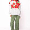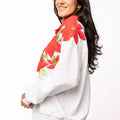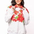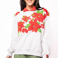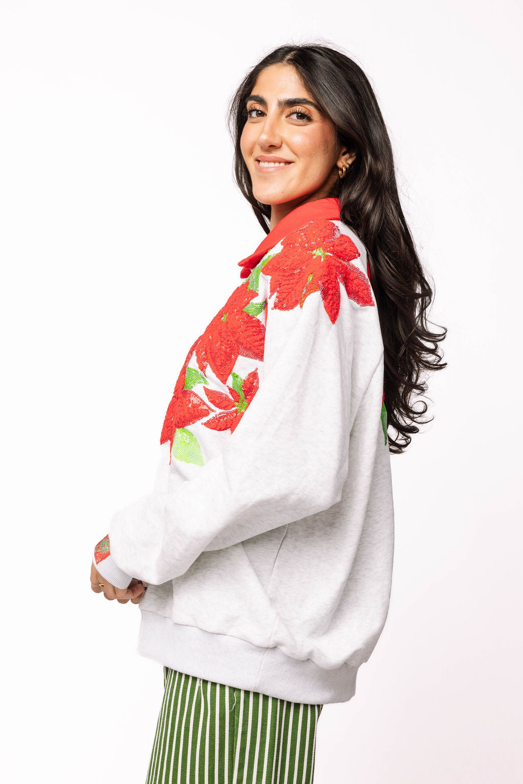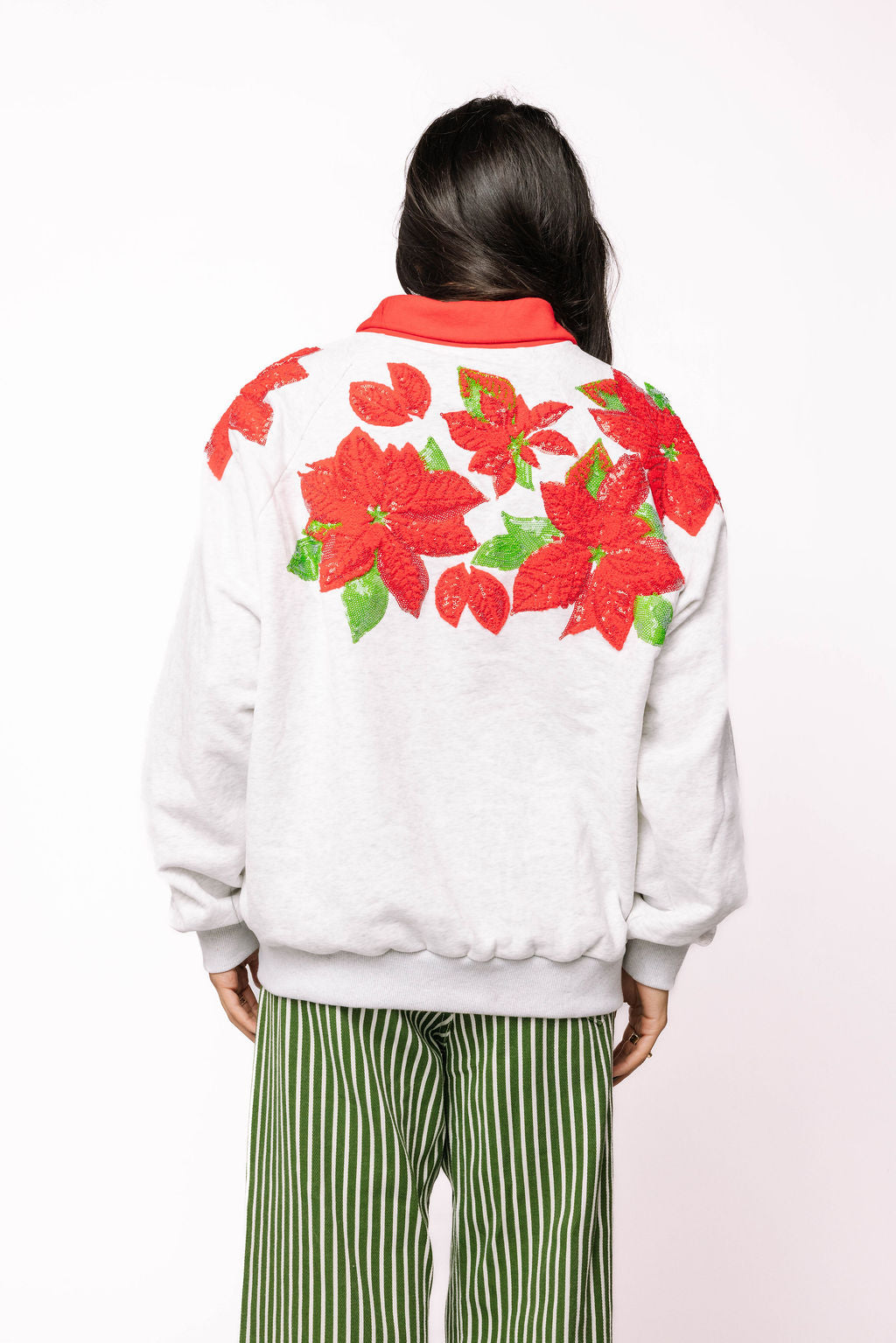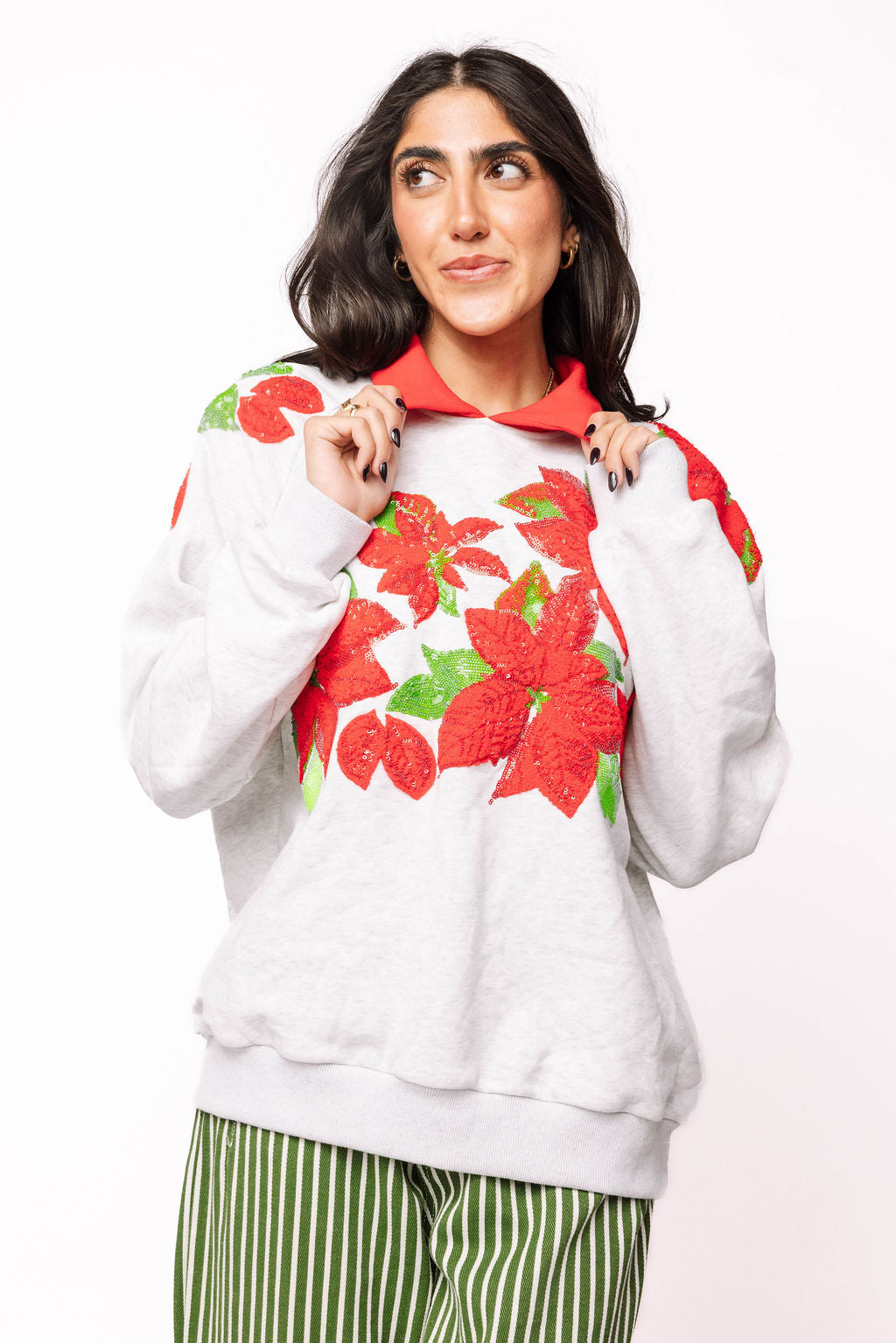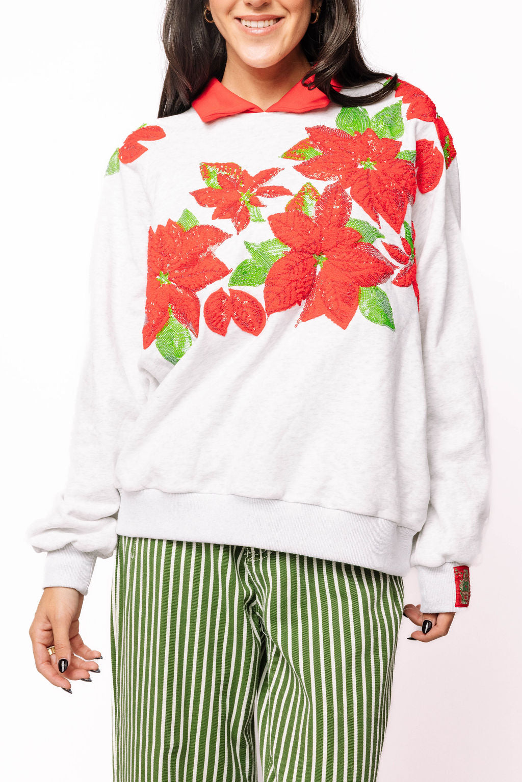 Bring vintage holiday charm to your wardrobe with this grey sweatshirt featuring a festive red collar and a cheerful poinsettia design. Cozy and playful, it captures the nostalgic spirit of classic Christmas outfits while keeping you warm and stylish for all your seasonal celebrations. Perfect for spreading holiday cheer with a splash of retro fun!