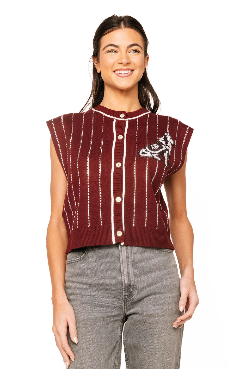 Show your Aggie pride in style with this licensed Texas A&M striped knit vest. Featuring the iconic A&M mascot embroidered on the left chest, this versatile piece layers perfectly over your favorite tee for game day or casual wear. The classic striped knit construction offers comfort and breathability, while the button-up front makes it easy to adjust your look. Whether you're cheering in the stands or showing support around town, this vest combines school spirit with timeless appeal that any Aggie fan will love.