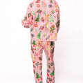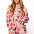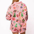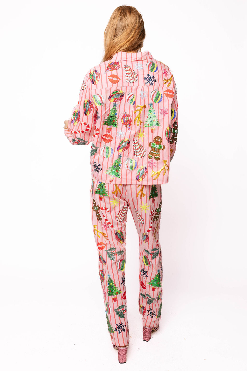 This light pink button-up top features vibrant red stripes and playful sequin Christmas icons scattered all over, adding a festive sparkle to your holiday wardrobe. Perfect for cozy gatherings or seasonal fun, it pairs effortlessly with matching shorts or pants for a complete, cheerful look. Celebrate in style and comfort with this merry and bright design!