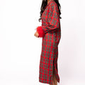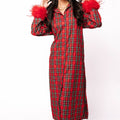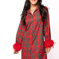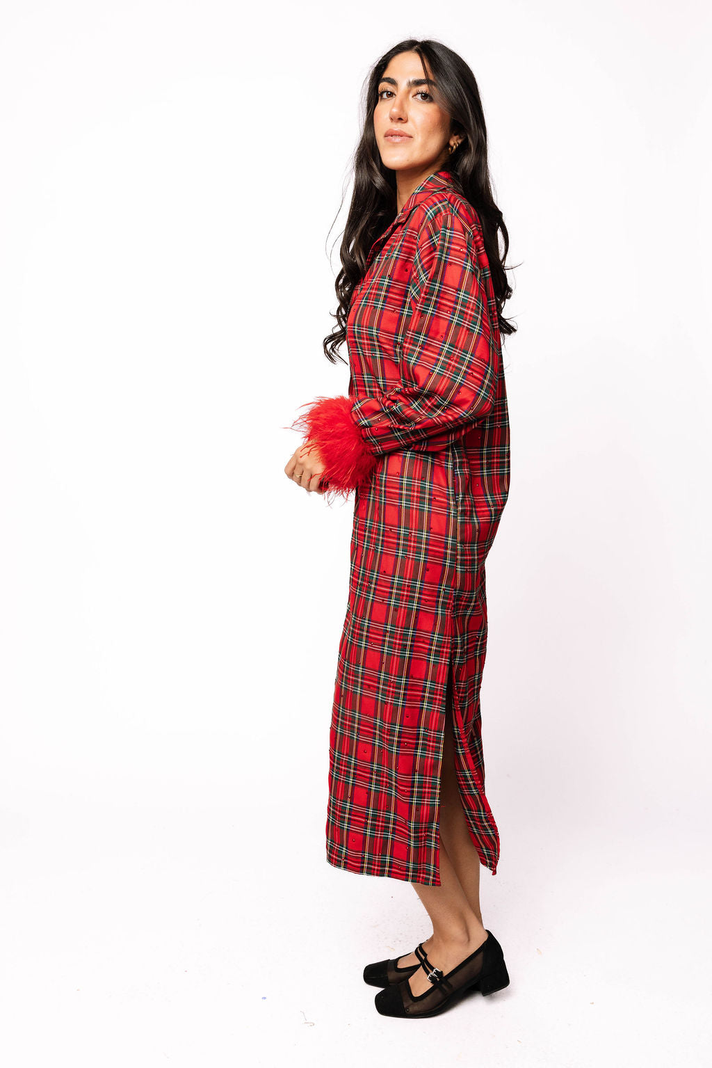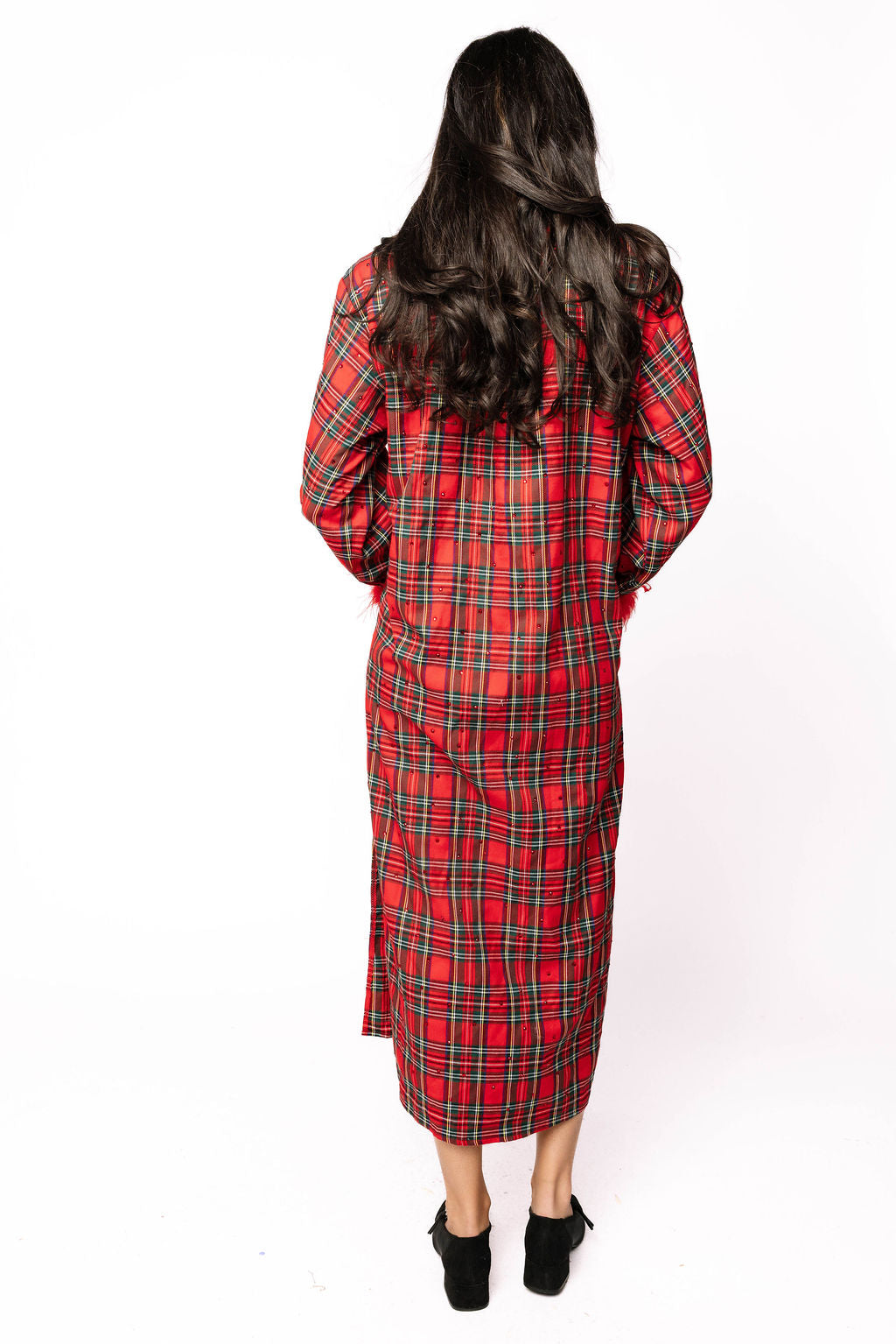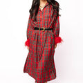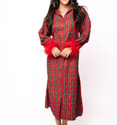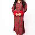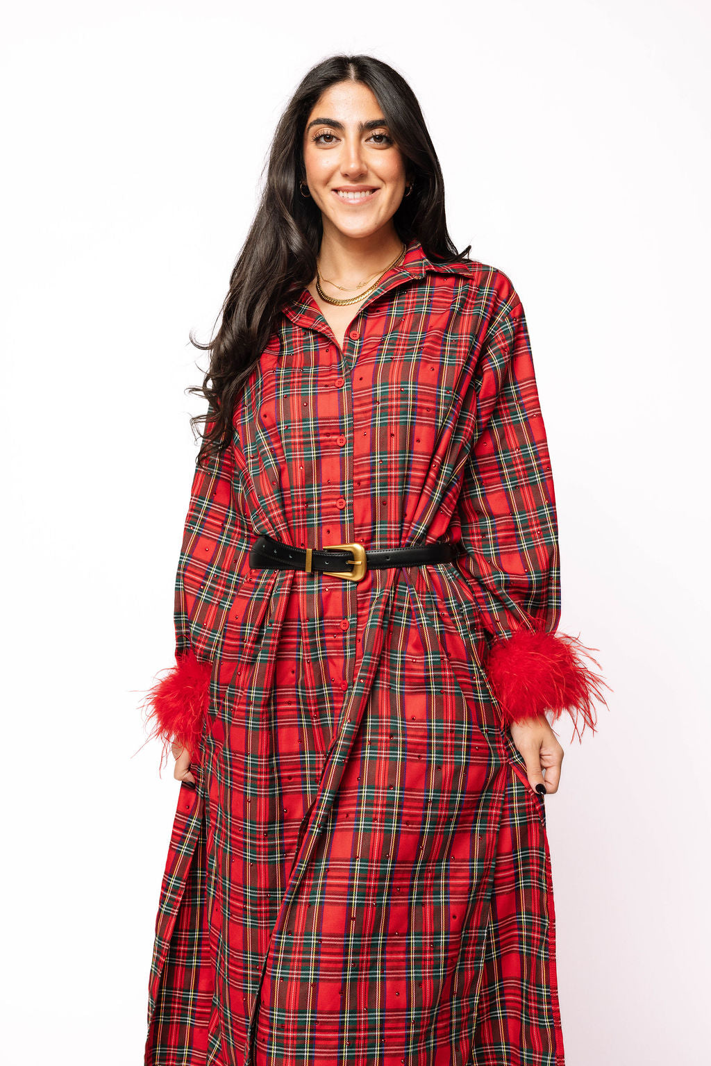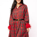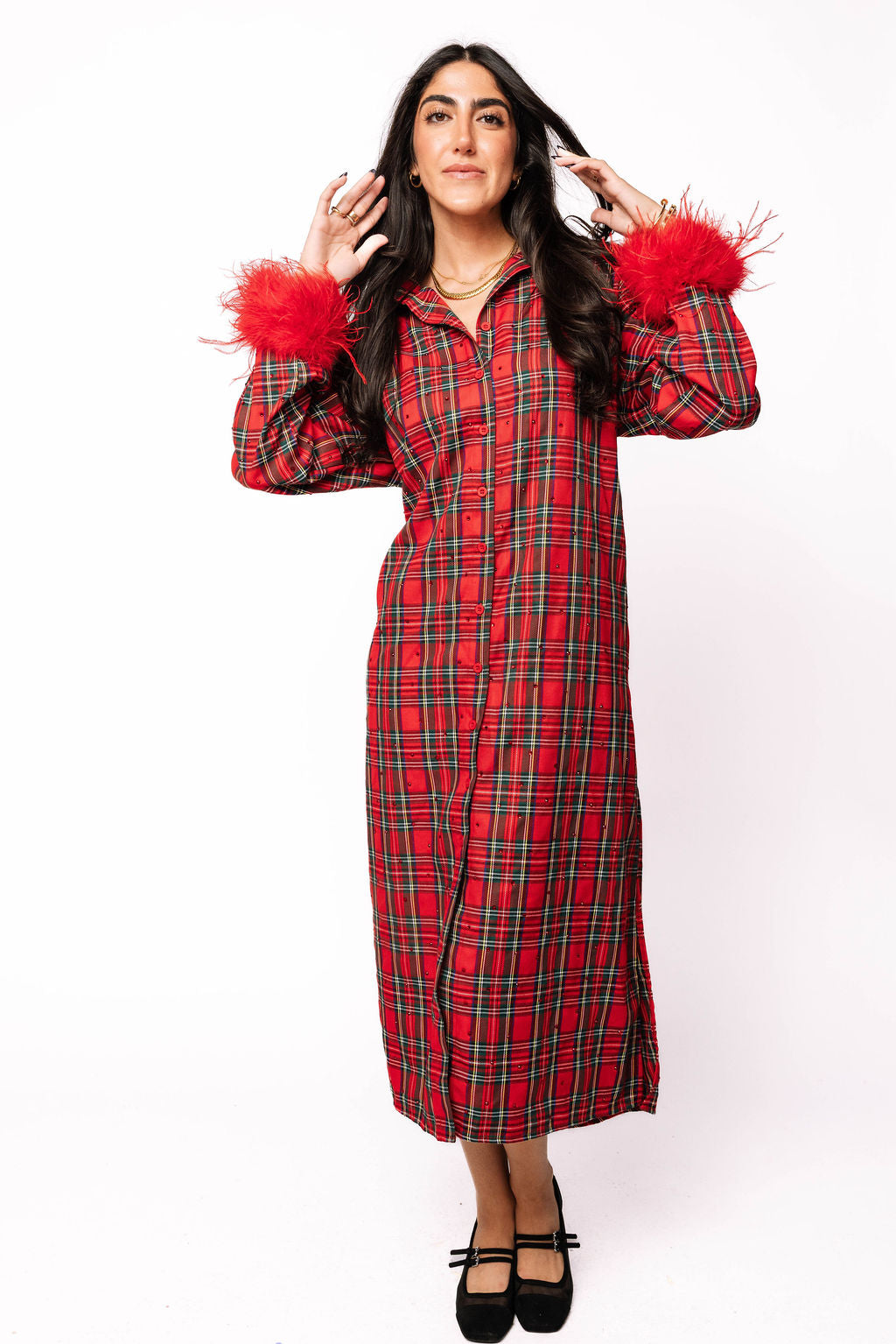 This red and green plaid midi dress brings fun to your wardrobe with its playful feather sleeve cuffs and oversized, flowy fit. The button-up front adds a classic touch, while the relaxed silhouette keeps you comfortable and effortlessly stylish all day long. Perfect for cozy days with a spark of flair!