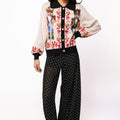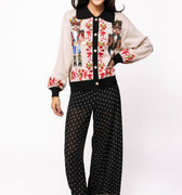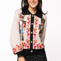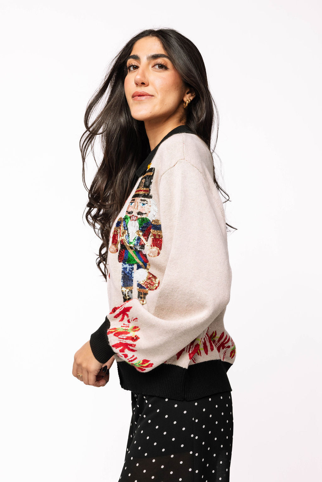 Add festive charm to your wardrobe with this playful collared cardigan featuring whimsical nutcracker and candy cane designs. Its true-to-size fit makes it easy to layer over your favorite holiday outfits, bringing cozy comfort and cheer wherever you go. Perfect for spreading joyful vibes this season!
