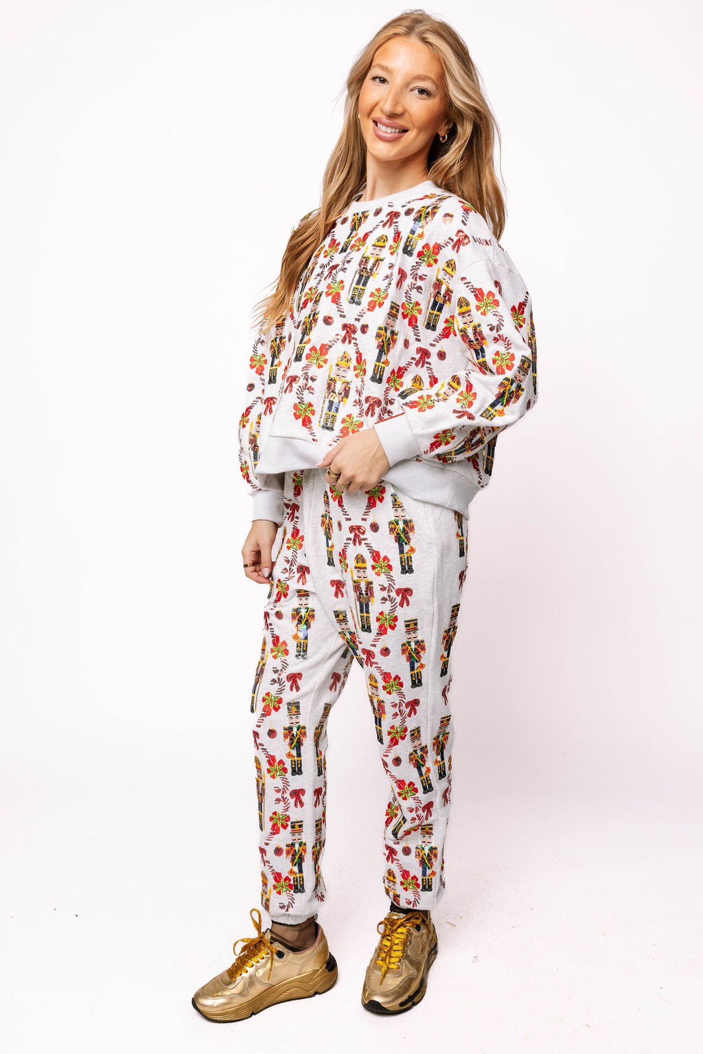 Step into holiday cheer with the Grey Nutcracker & Candy Cane Pant! These cozy pants bring festive fun to your wardrobe with whimsical nutcracker and candy cane patterns. Perfect for lounging or holiday parties, they offer comfort and a playful spirit that keeps the season bright and merry. Celebrate in style and ease all day long!