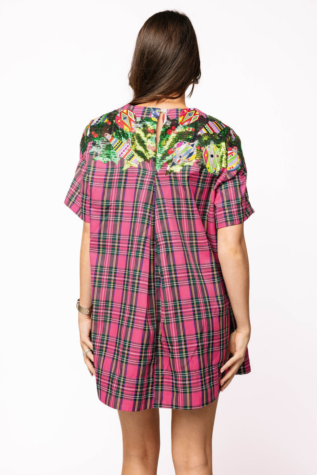 Pink Plaid Metallic Wreath Short Sleeve Cotton Dress