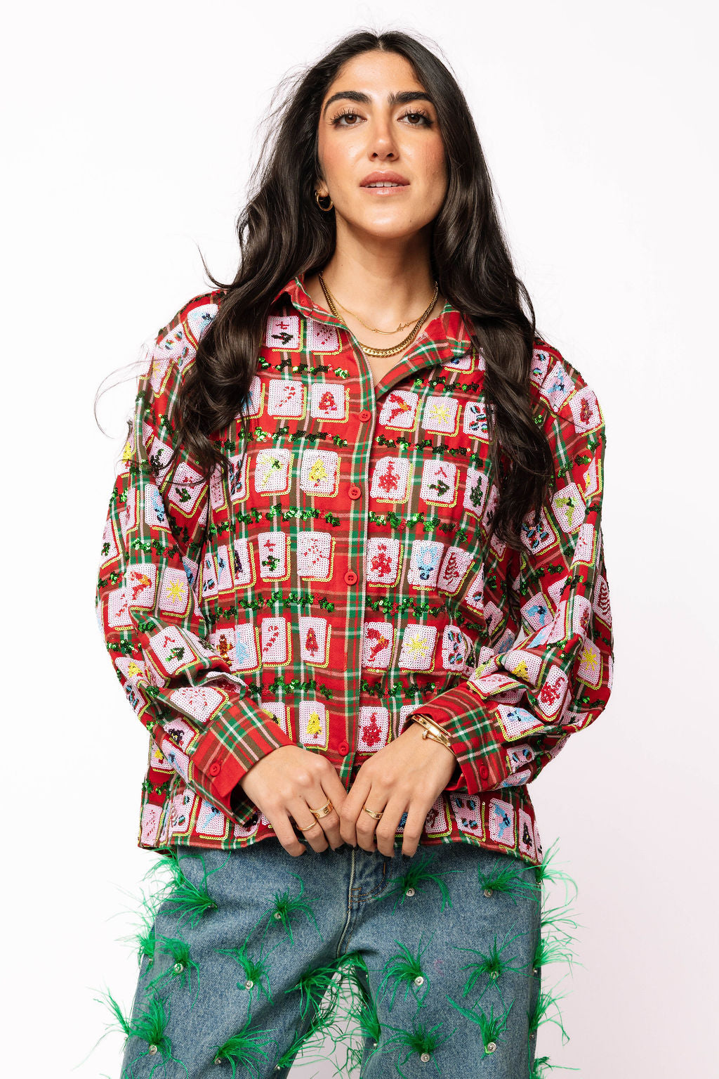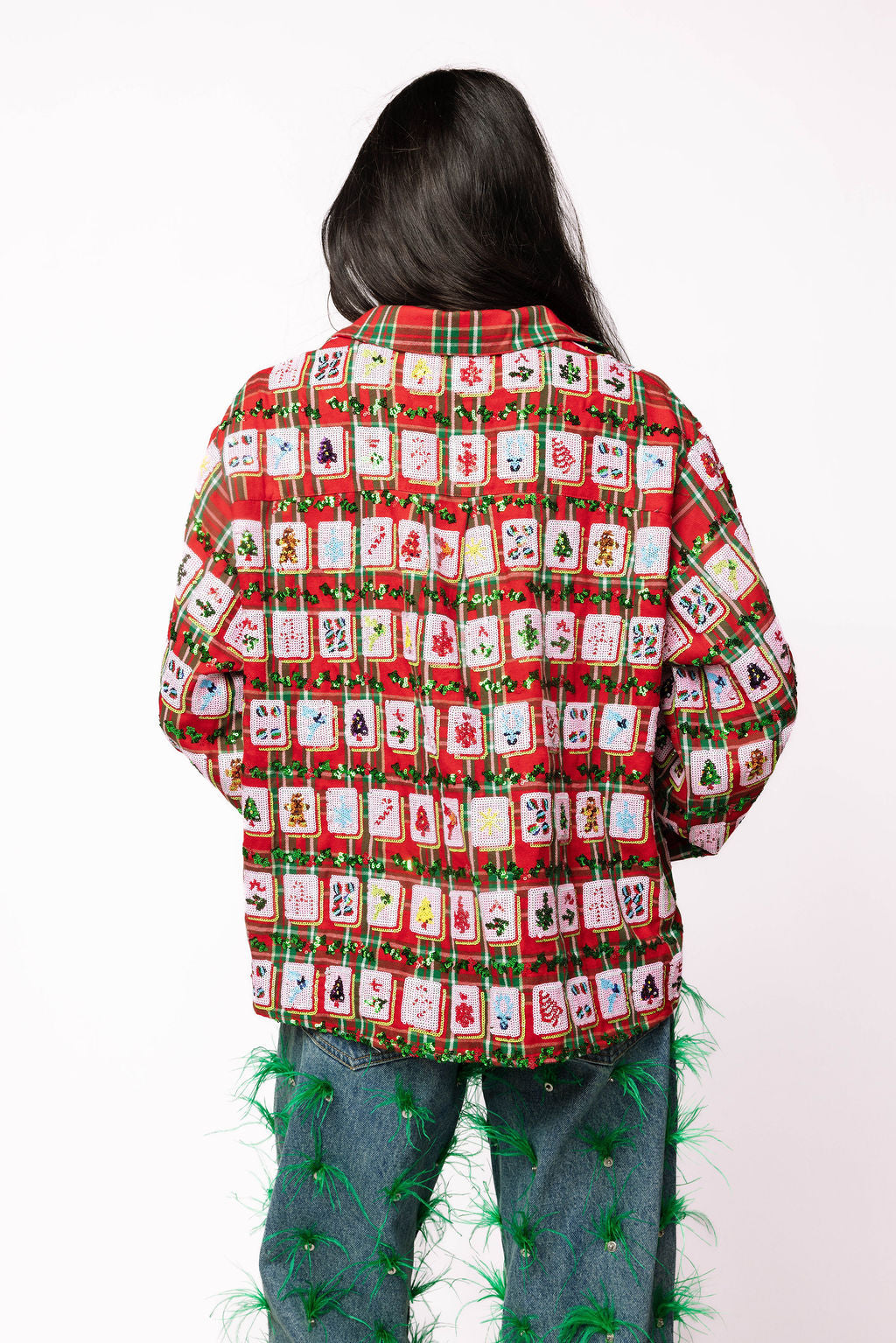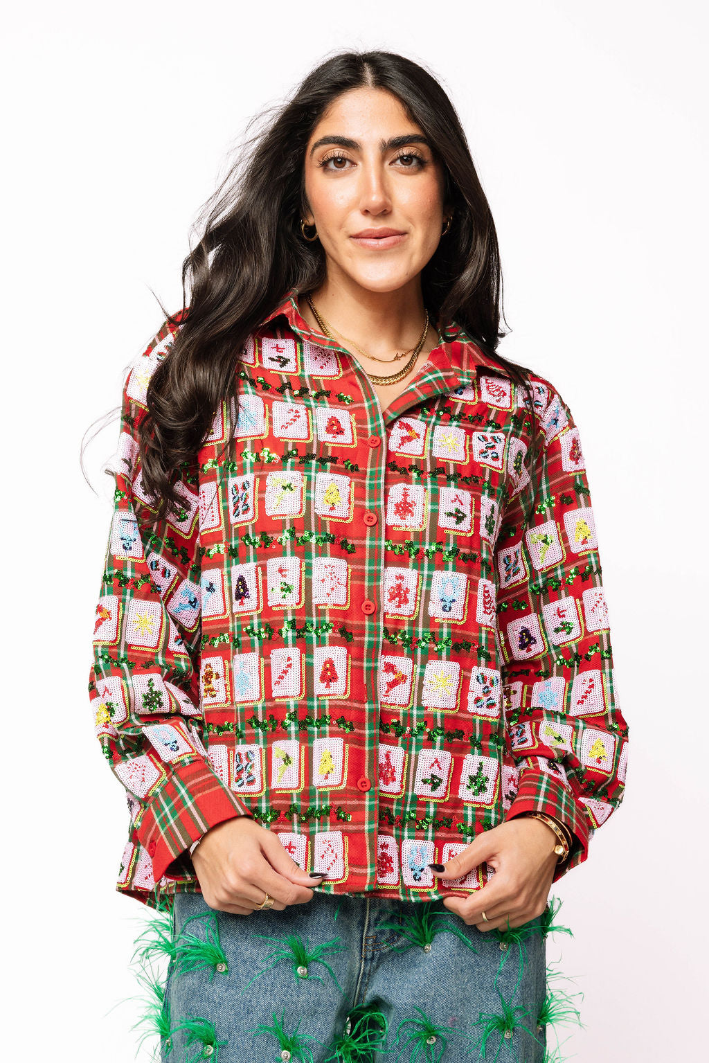 Add a fun twist to your wardrobe with this Red Plaid Mahjong Tile Button Up Top! Featuring a lively plaid pattern inspired by classic mahjong tiles, this playful shirt brings a pop of color and personality to any outfit. Perfect for casual days or game nights, its button-up design offers easy styling and comfort. Stand out with this unique top that’s as vibrant and spirited as you are!